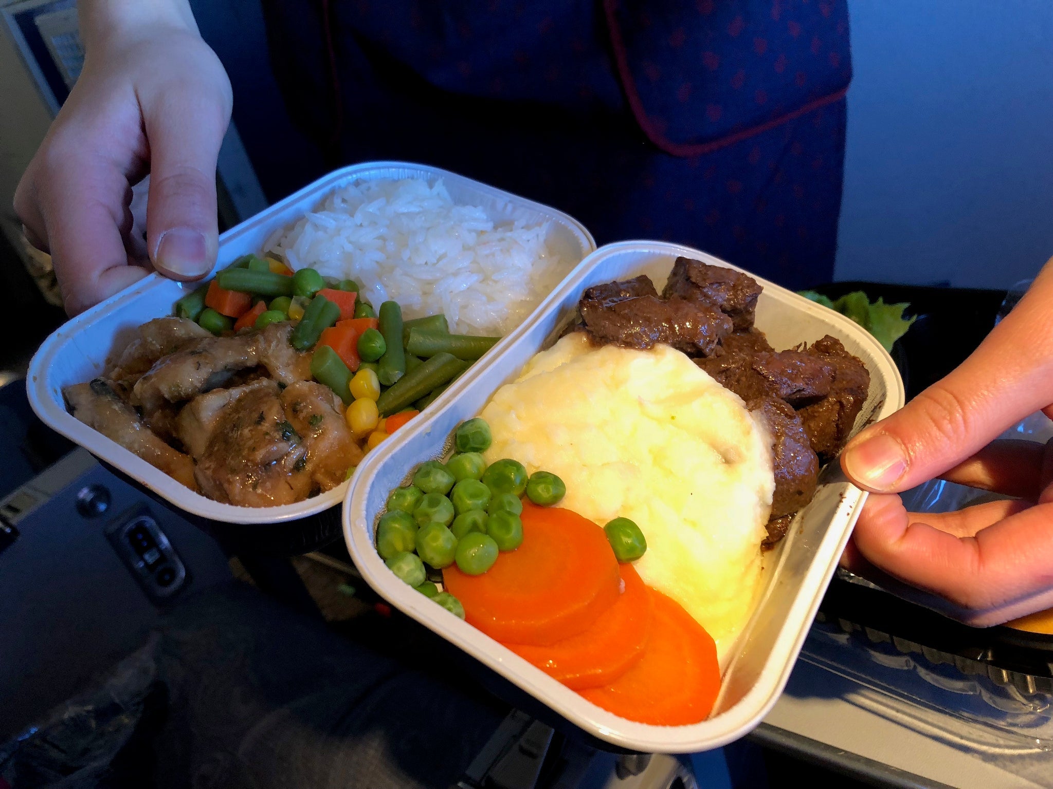 Moving on to the main entree, I was offered a choice between chicken and beef. These were of standard economy-class quality — a solid 5/10 and nothing to write home about. The herbs in the chicken seasoning were a surprisingly nice touch, and the powdered mashed potatoes tasted vaguely buttery. Both proteins were on the dry side, and the formerly frozen veggies were lackluster.