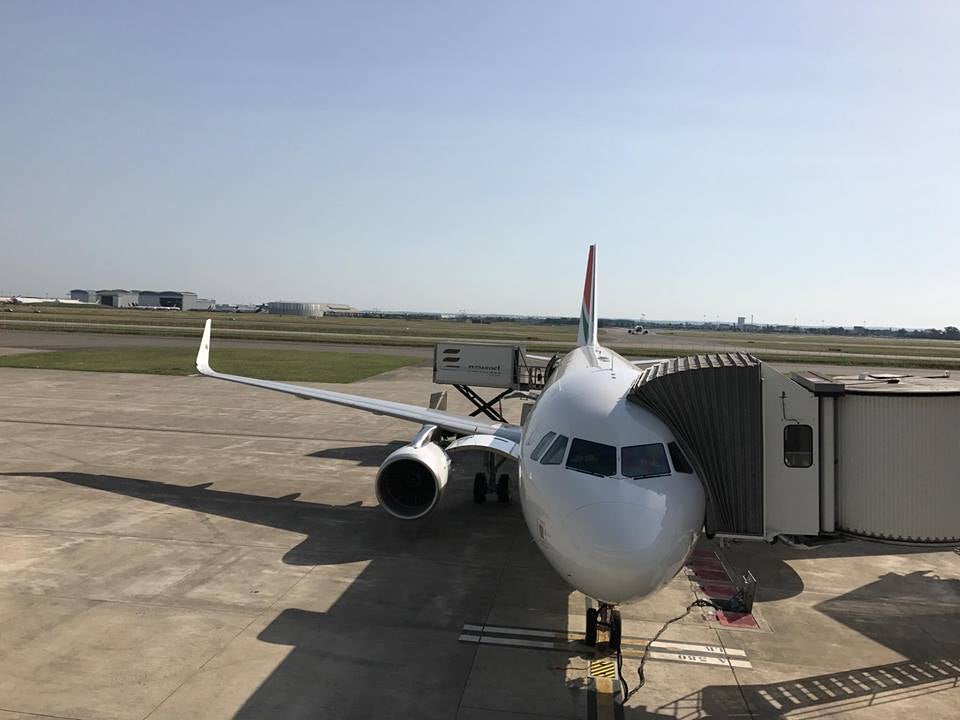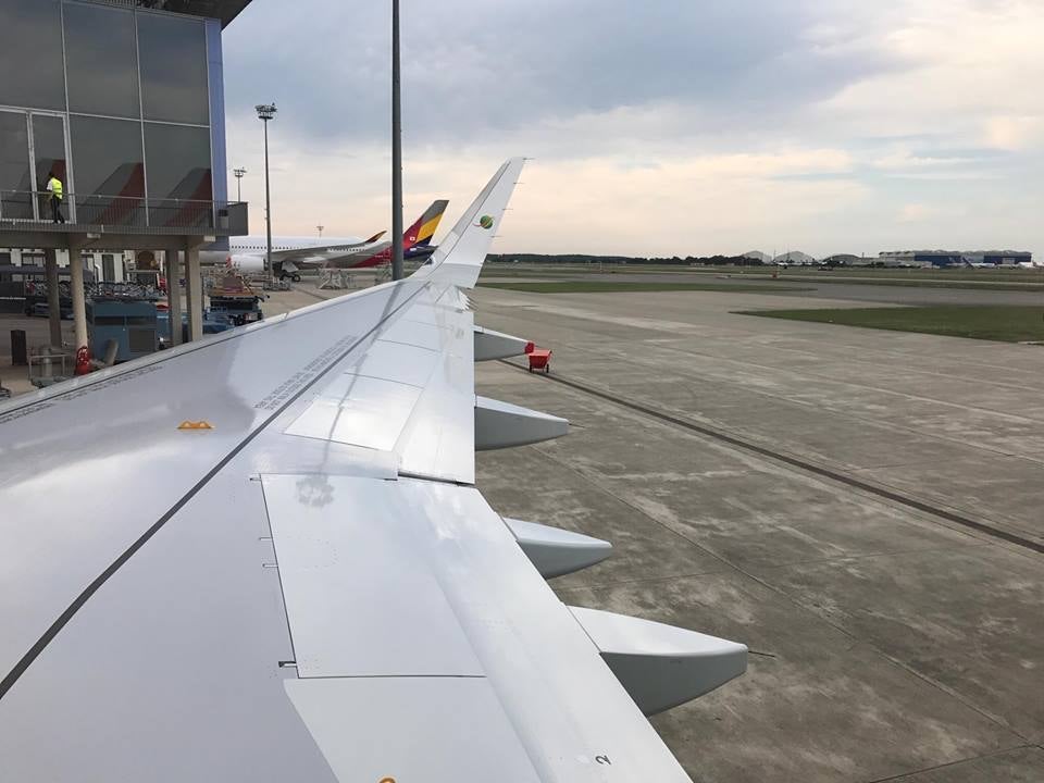 As a I mentioned earlier, there is no in-flight entertainment available if you're flying in economy — not even drop-down overhead screens — which is a huge shame, however, as indicated by the overhead panel, Wi-Fi is available onboard the aircraft via OnAir. It's currently free, although that could change once the aircraft enters commercial service. Here's a peek at the wing, which features the airline's logo on the sharklets.