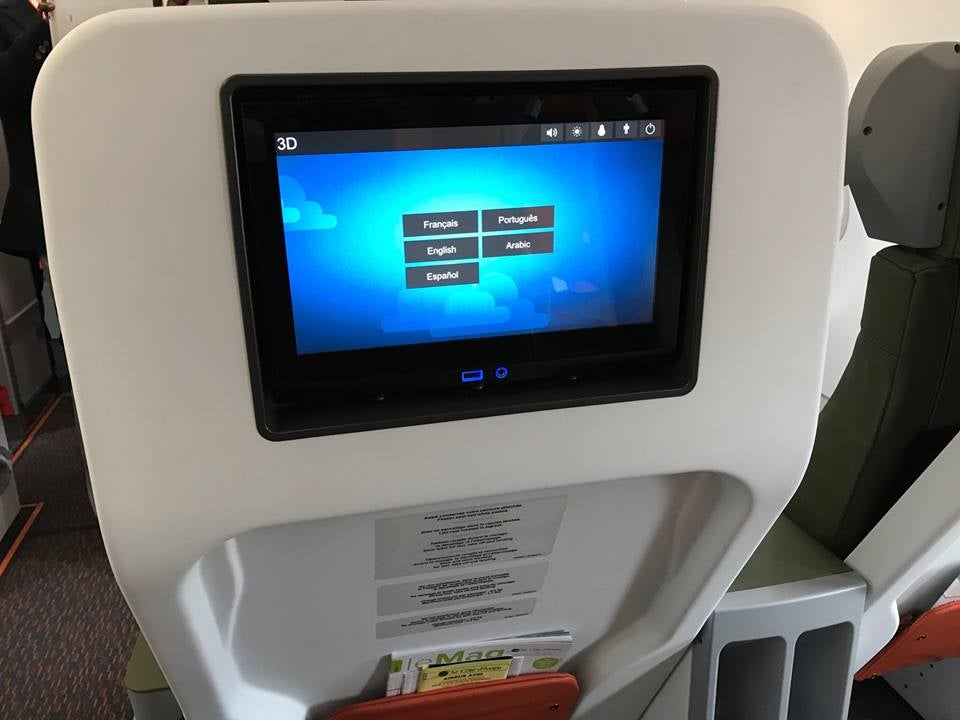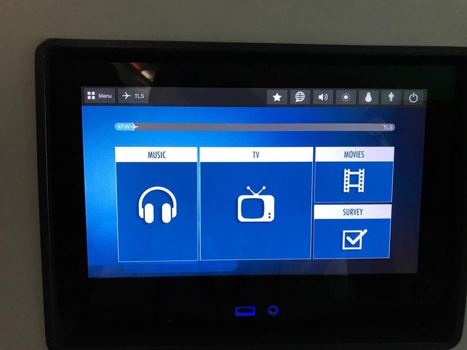 In-flight entertainment screens are 16 inches wide and offer a universal headphone jack and USB port for charging. The menu is simple and clean, with music, TV, movies and survey being the only four options.