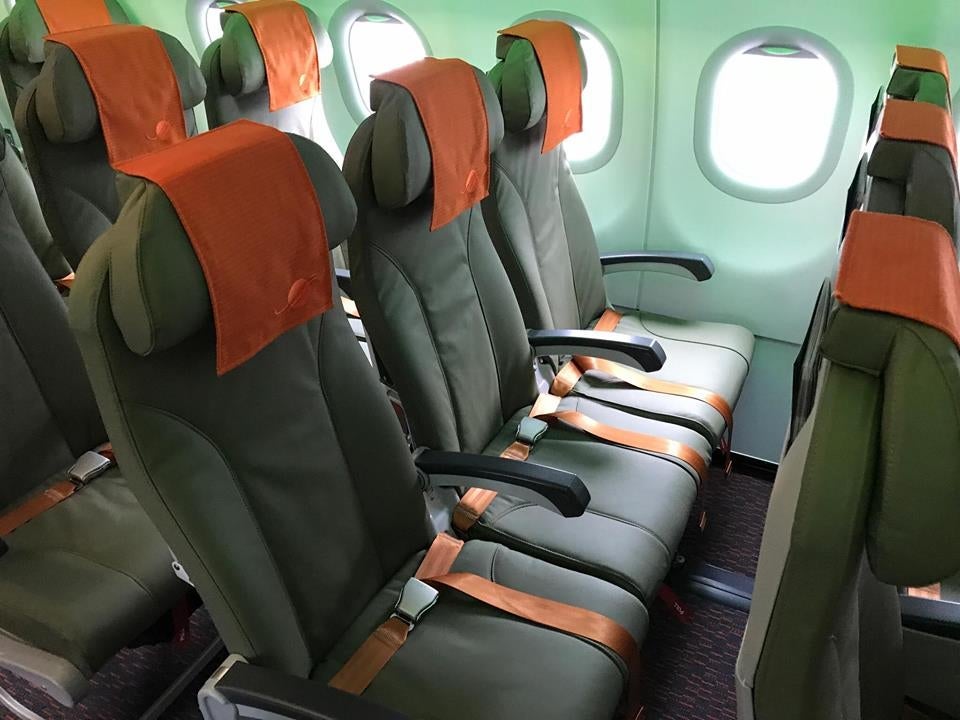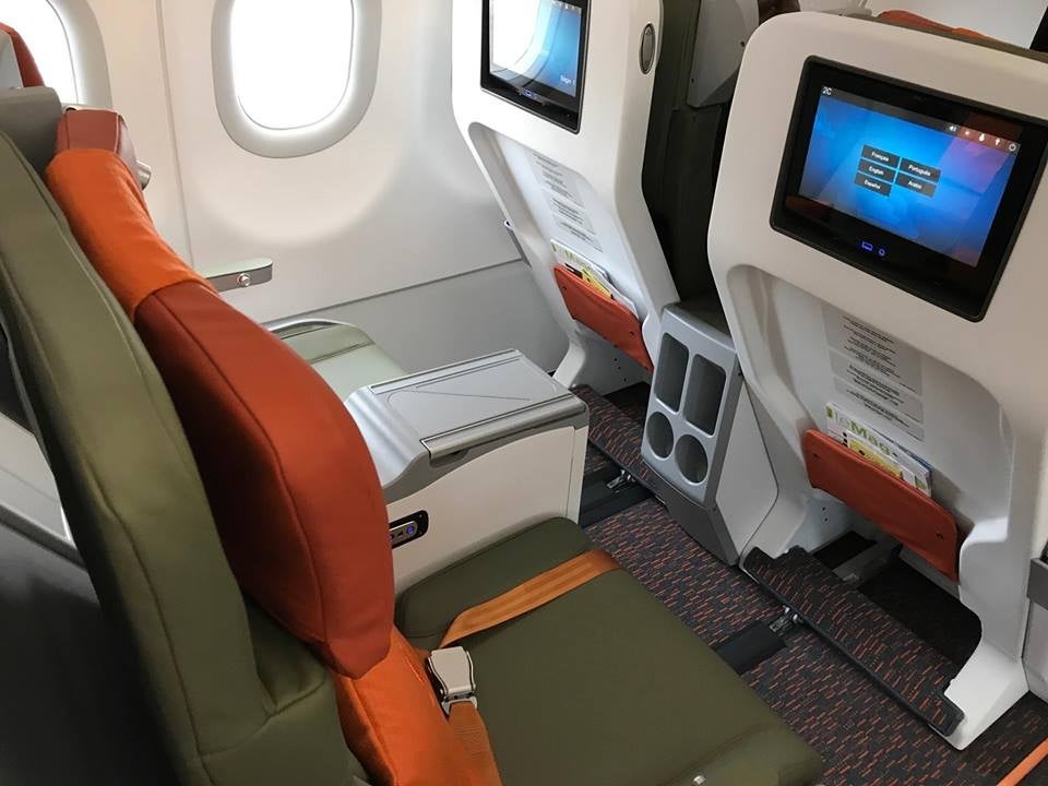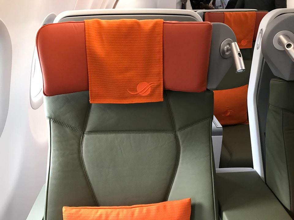 Seats are upholstered in the same green leather, with an orange cloth covering the headrest, which, like in business class, can be molded for extra comfort.
