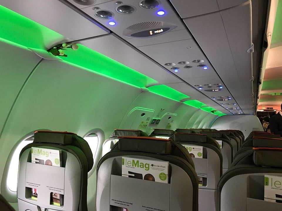 What I really love about the new single-aisle Airbus aircraft is the extensive cabin mood-lighting options that are available. Air Côte d'Ivoire used it to illuminate the cabin in the colors of the Ivory Coast flag. I think this is a feature that many Air Côte d'Ivoire passengers will be very impressed by, especially given the lack of new planes flying in West Africa.