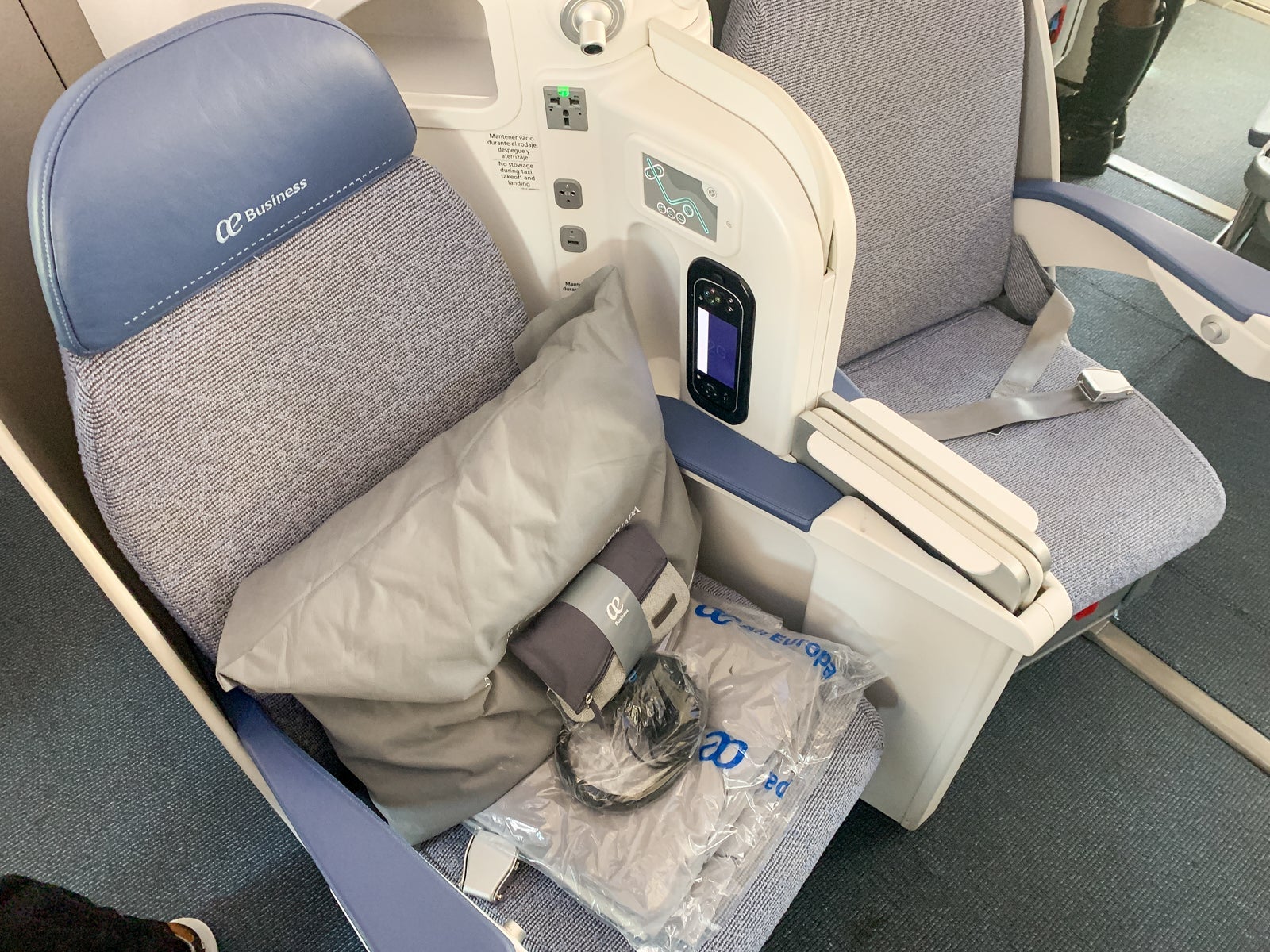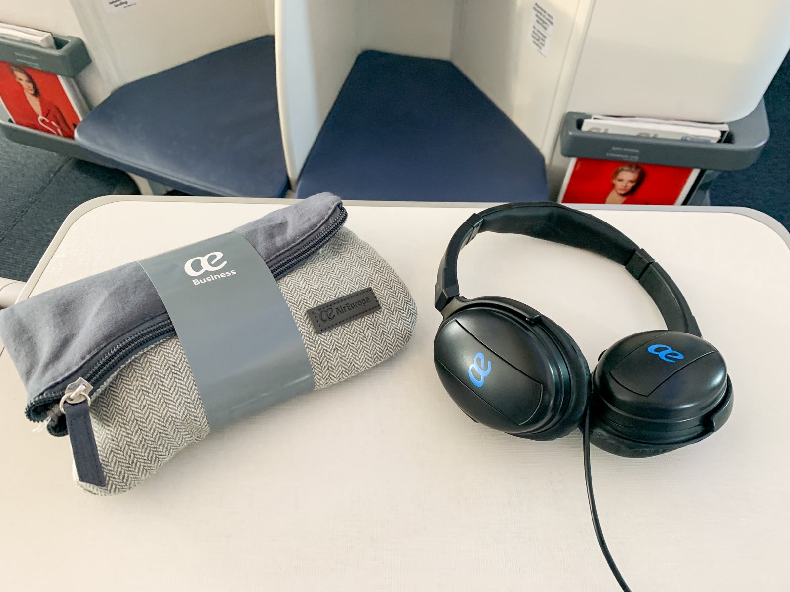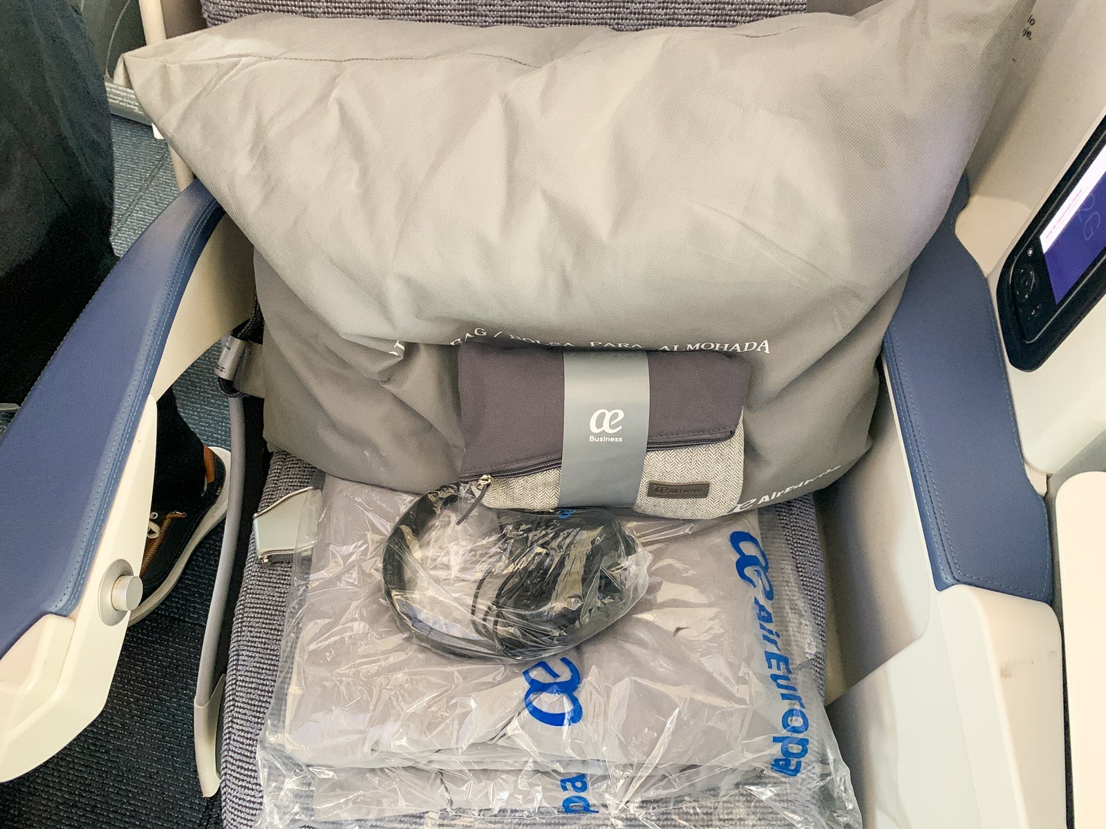 When I got on board, I found a large pillow wrapped in a fabric bag, a pair of mediocre headphones, a blanket and mattress pad wrapped in plastic and an amenity kit.