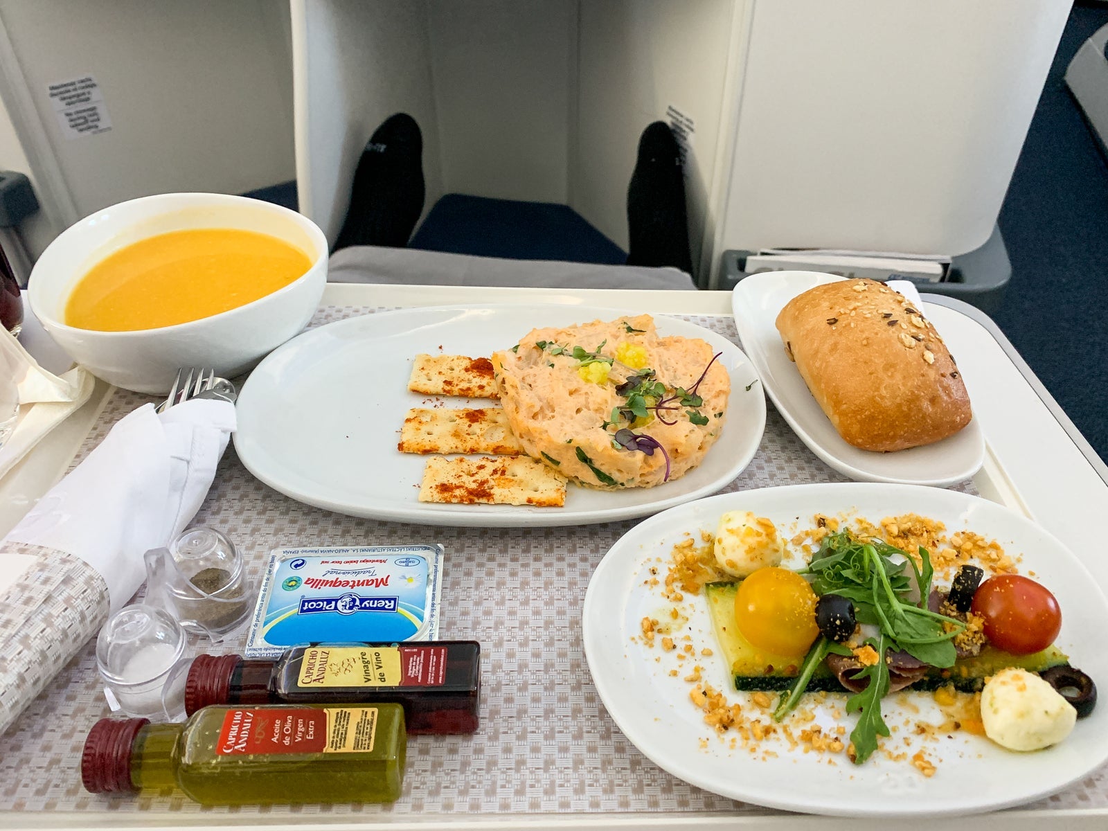 After the sushi course was complete, flight attendants returned to take orders for the starters and main course. The starters on the menu included: red and yellow cherry-tomato salad with duck breast, mozzarella and pesto; and cod rillettes with paprika mayonnaise, olive oil and salad.