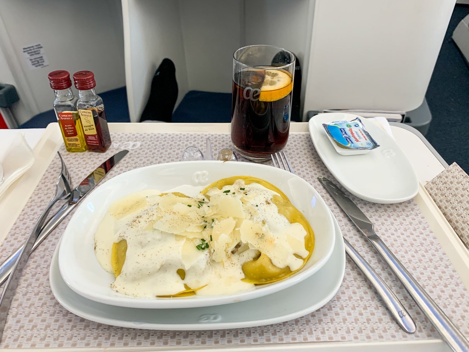 I wanted to have the Iberian ham dish because, well, Spain, but the FA told me they were out of it, which was sort of shocking to me given how empty the cabin was. The pasta was my second choice, and they did have a dish for me. It did not disappoint, either. It was gloriously rich -- more than enough to put me into the mood for a nice nap.