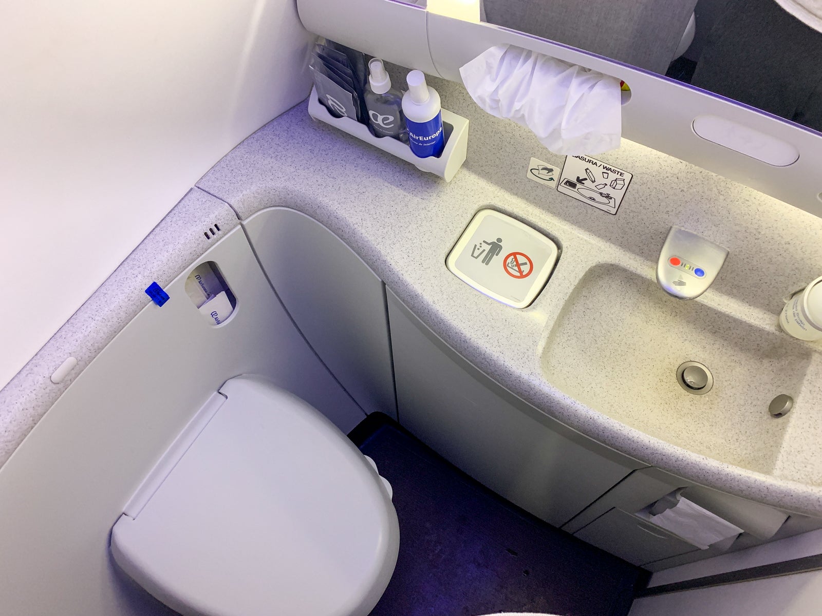 Business-class passengers had access to two lavatories -- one in the front of the cabin and one in the back. Predictably, the rear one was also used by economy passengers, so sometimes there were lines. They were about as standard as they come, though the front lav did have a few amenities.