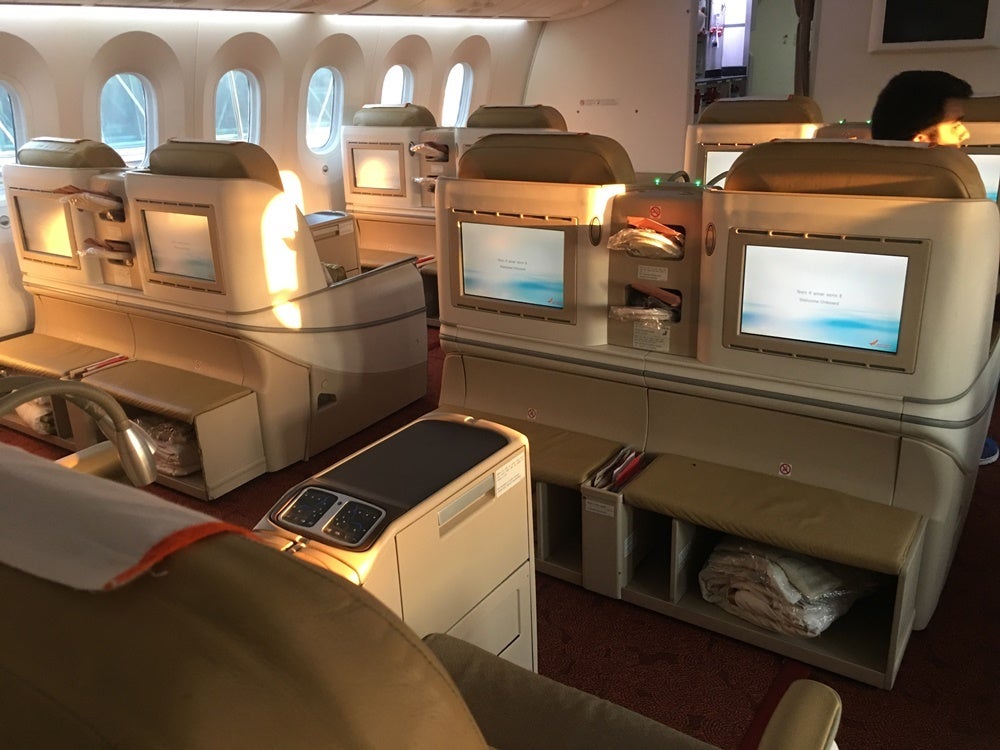 The economy section of the plane is laid out in a 3-3-3 configuration, which is standard for a Dreamliner. Each of the 238 economy seats has a width of 17 inches and relatively good legroom, with a pitch of 33 inches.