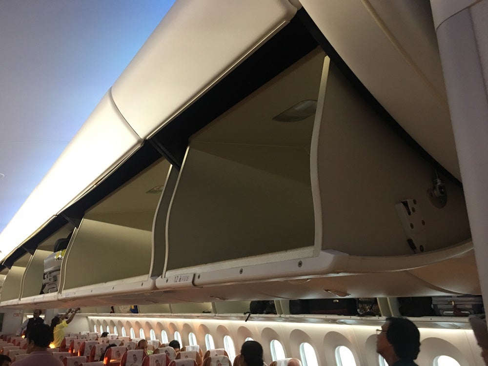 Everything on the plane looked tired, though the overhead bins were nice and large — one of the features of the relatively new 787 aircraft.