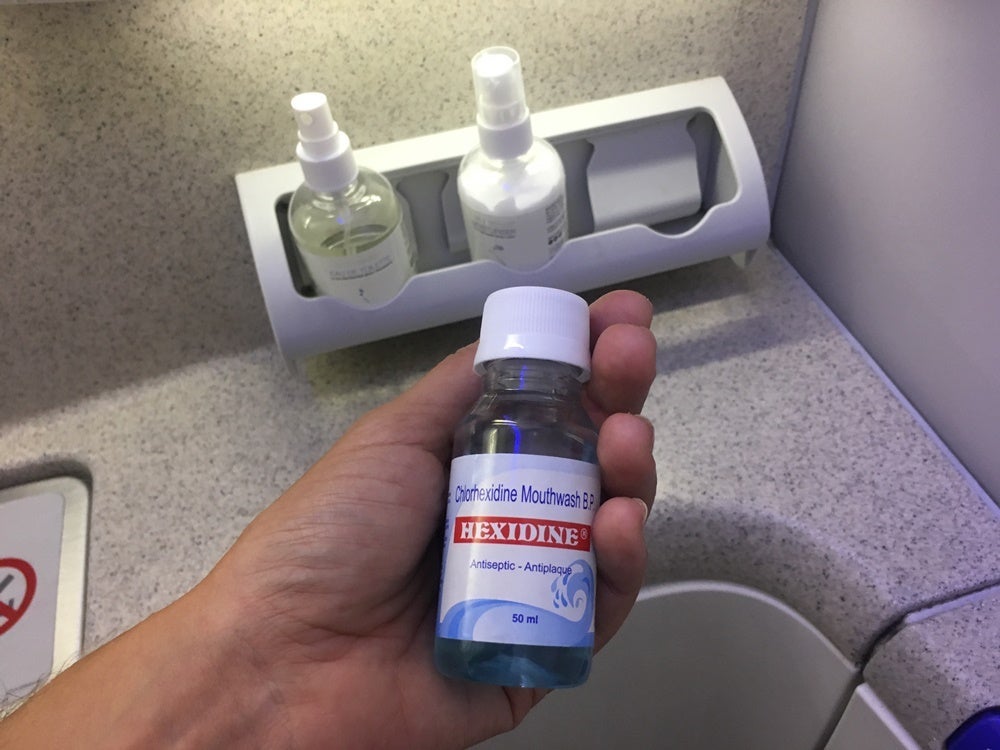 The lavatories were standard, though I noticed they came stocked with a bottle of mouthwash next to the hand cream and antibacterial gel, which I found really weird.