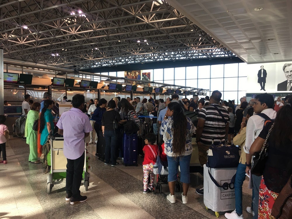 Turns out, the Air India check-in line in Milan was very long, as each person was checking a ridiculous amount of baggage. Air India's baggage allowance is two bags per person in economy, and it seemed like just about everyone in line was taking advantage of this. After spending almost 15 minutes at the counter myself for a standard check-in for two, each of us with only one checked bag, I realized the desk staff was about as competent as the phone reps were.