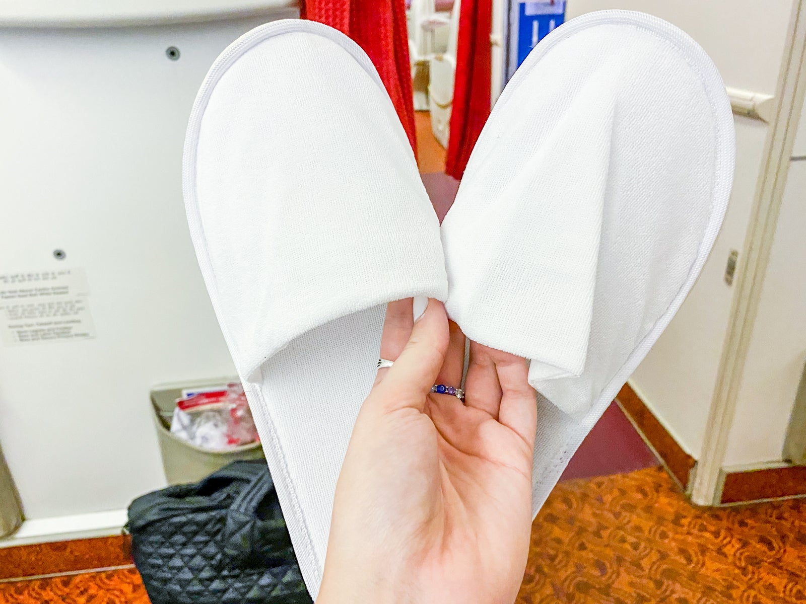 The comforters were stored in one of the overhead bins, and once we were in the air, flight attendants plopped one on my lap.