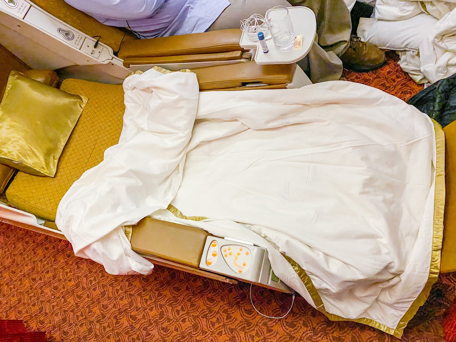 The seat felt like cardboard, the flight attendants were incredibly rude and the IFE system was comically outdated. There was nothing premium about this experience, except for the fact that the seat was (almost) lie-flat, a godsend when spending about 20 hours on the plane, including the time we spent on the ground as well as in the air. It must be said that the price was not premium, either, which is a small consolation.