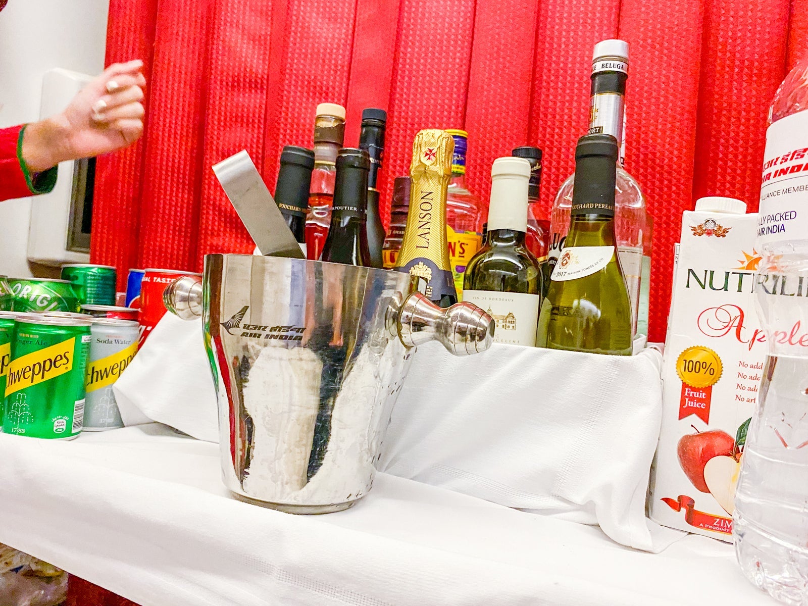 Upon boarding, flight attendants served water, juice or wine as a welcome drink. I opted for water. They did not offer Champagne until later.