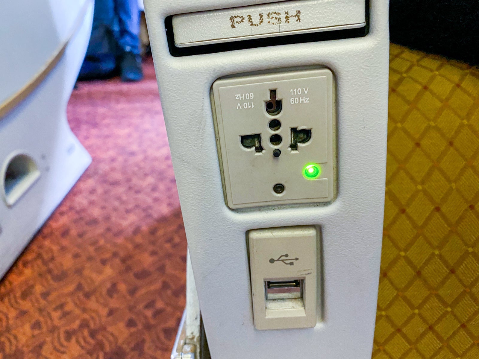 There also is one USB outlet plus an international power outlet on the side of the seat.