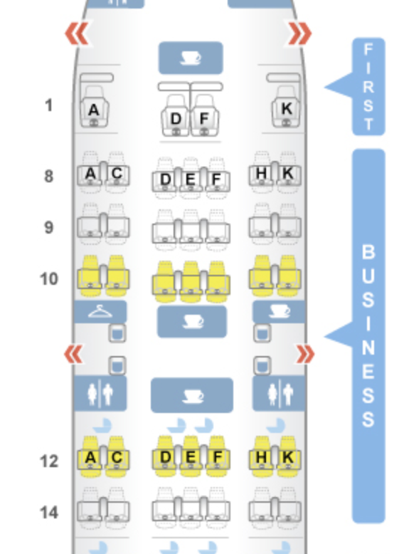 [flight_stats ticket-class="first" review-stat-section="Cabin and Seat" tpg-rating="12" tpg-rating-max="30" configuration="2" configuration-2="3" configuration-3="2" width="20" lavs="2" live-tv="0" tailcam="0" headphones="0" comp-alcohol="0" extra-pillows="0" turndown-service="0" /]