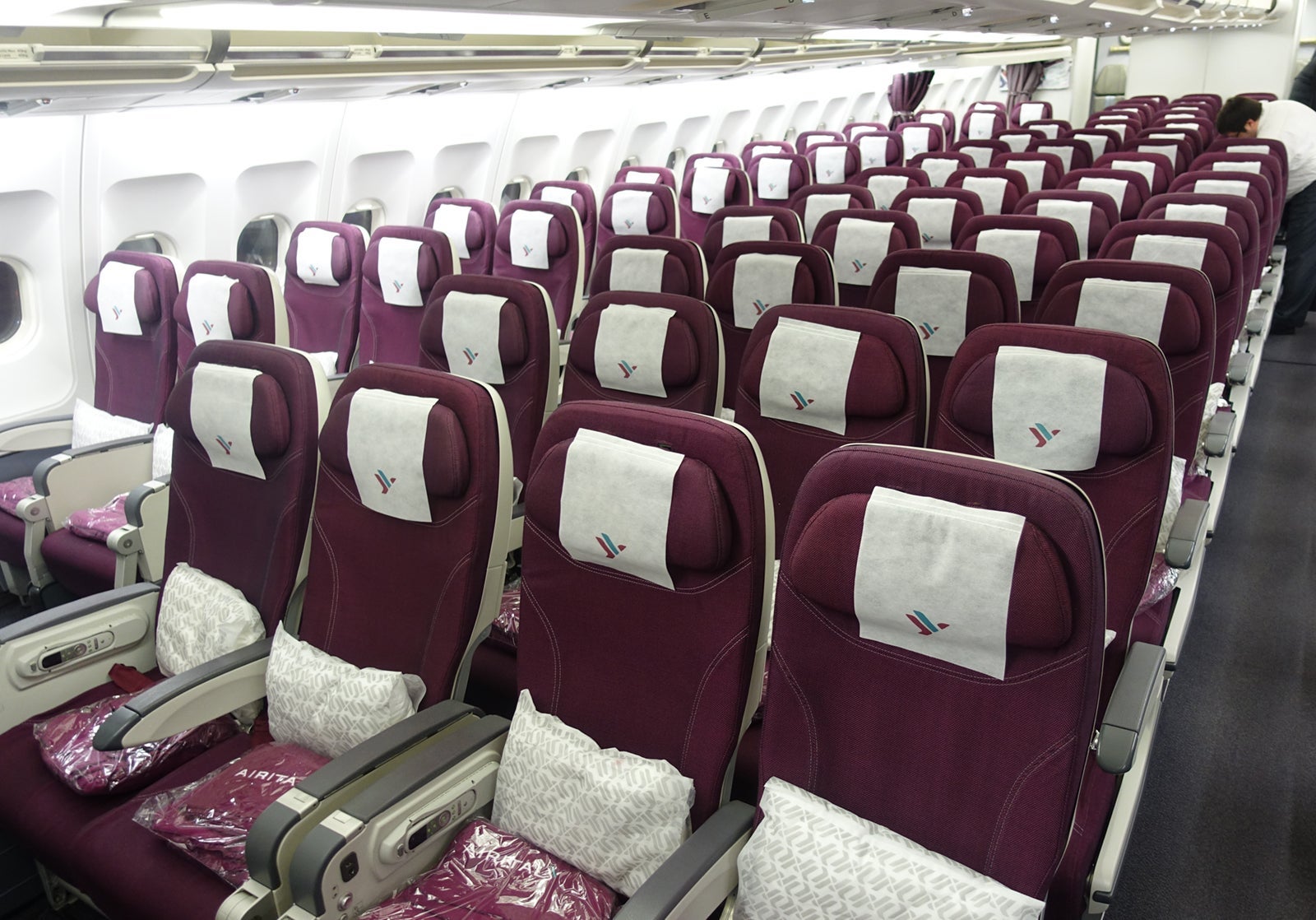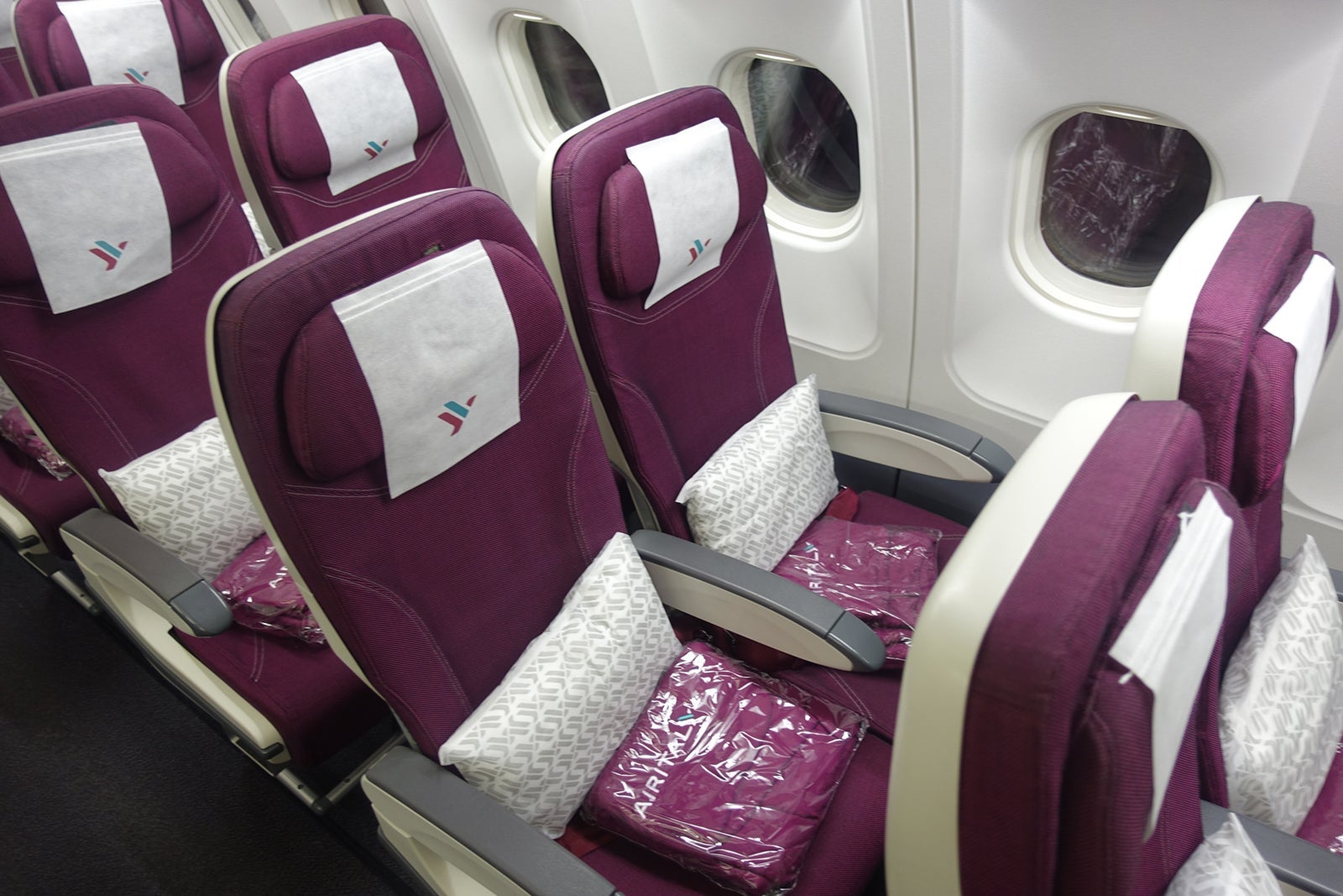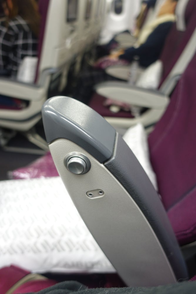 Positives included an adjustable headrest with head-supporting flaps that actually stayed in place, and a beautiful, breathable mesh upholstery. There was also a power outlet between each pair of economy seats. The USB outlet next to the IFE screen functioned as charger, too.