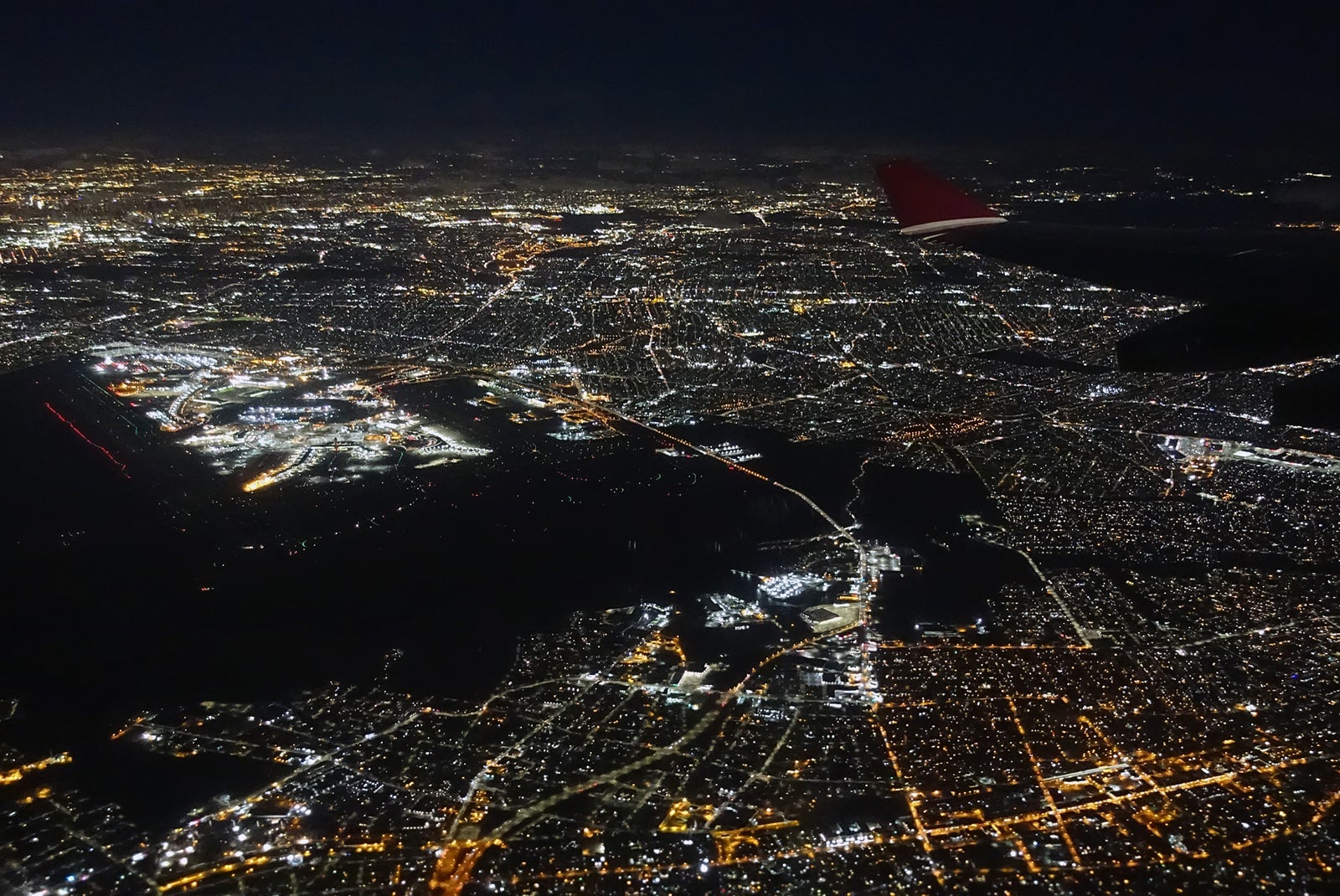 Capt. Rizzi told us flight time would be seven hours, five minutes — a fast run, thanks to the strong winter jet stream pushing us across the Atlantic — but with some turbulence early on. After a flight attendant walked down the aisle offering candy and cleansing towelettes (not hot towels) from a box, we lined up on JFK's Runway 31L at 9:07pm and were in the air after a quick takeoff run. After turning eastward to follow the coast of Long Island, we were treated to the lights of JFK shining bright to our left, above the dark water of Jamaica Bay.