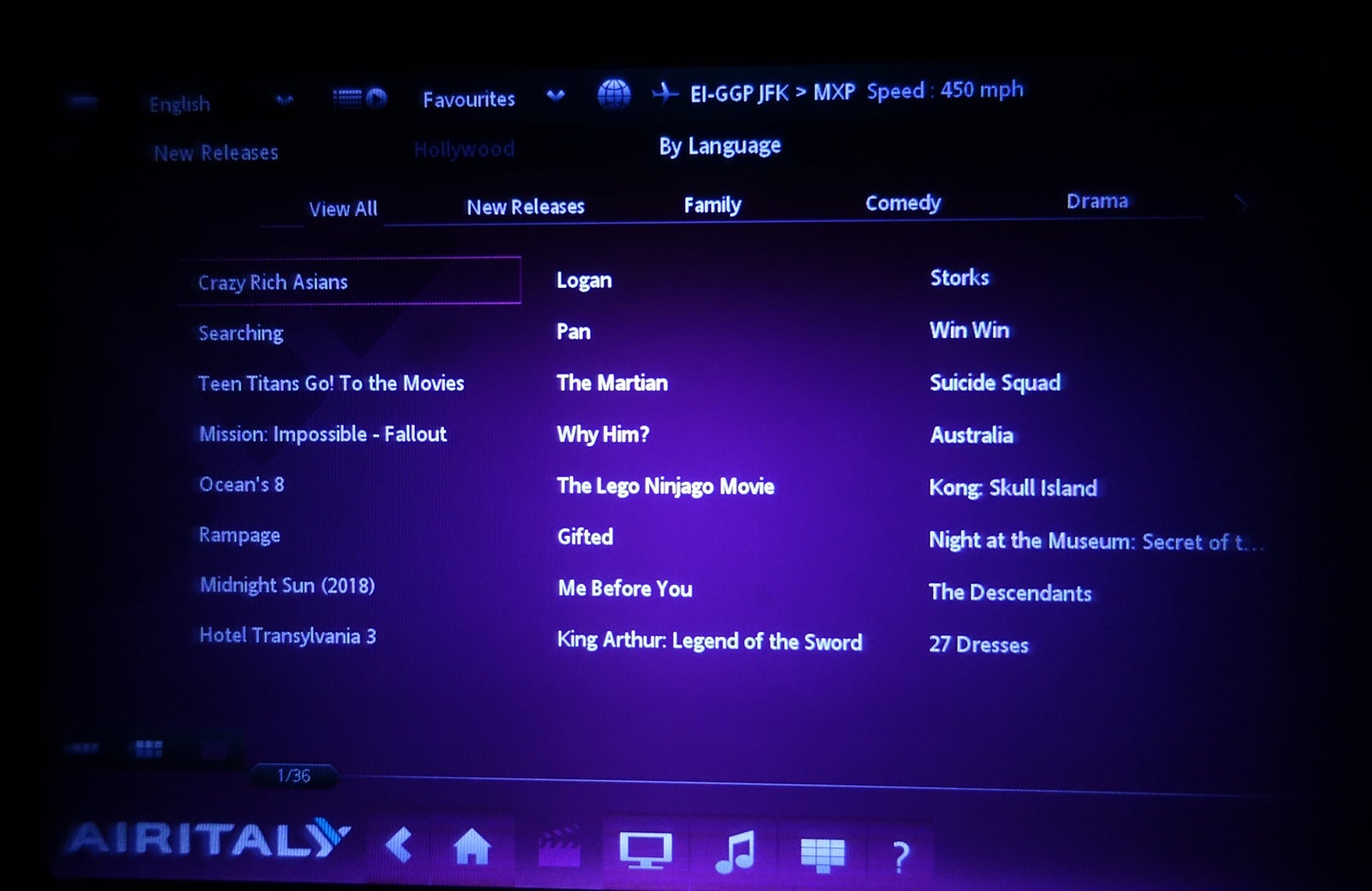 Live TV was listed as an option, but was unavailable. There was no outside camera either, while Alitalia offers one on its A330s. The moving map could not be zoomed, and the headphones provided by the airline were in-ear and low-quality — my advice is to always bring your own.