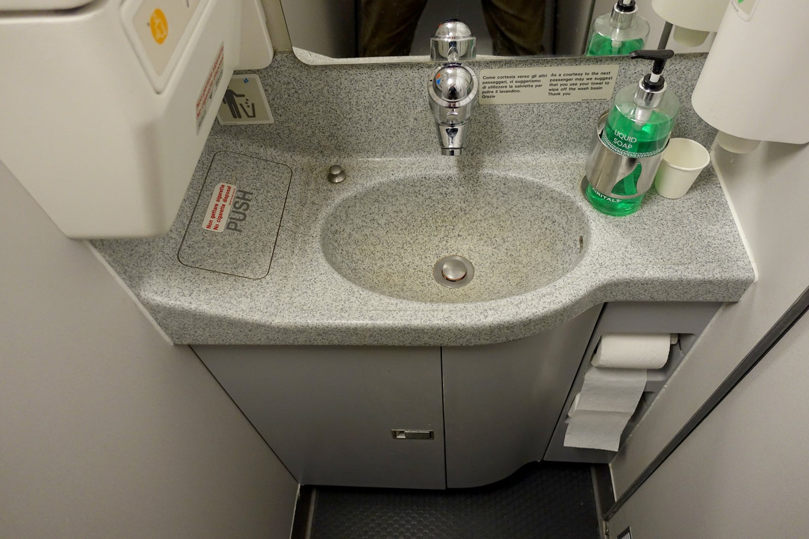 Coach class had five bathrooms, four at the back and one between the two economy cabins. They were standard-sized A330 lavs, and I found those I visited clean and well-kept.