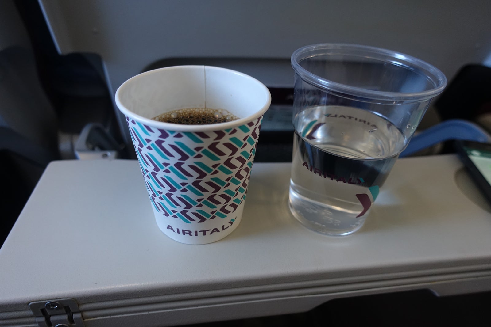 In business class, Air Italy serves ice cream and espresso — "Gourmet ice cream and original espresso coffee in the cup are introduced directly from the Italian tradition," in the bizarro English of the airline's site — but back in seat 32A, all I got was a paper cup of barely drinkable coffee. Definitely not from the Italian tradition, that.