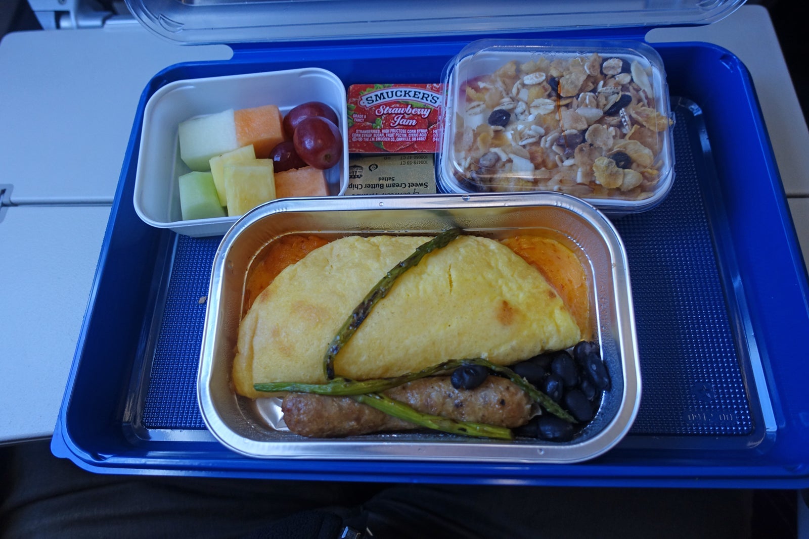 Served 45 minutes from landing, the breakfast omelet with cheese I selected over cinnamon-apple crepes was quite tasty, accompanied by fresh fruit — a decidedly better breakfast than on Alitalia, where they basically dump a warm croissant wrapped in cellophane on your tray table.