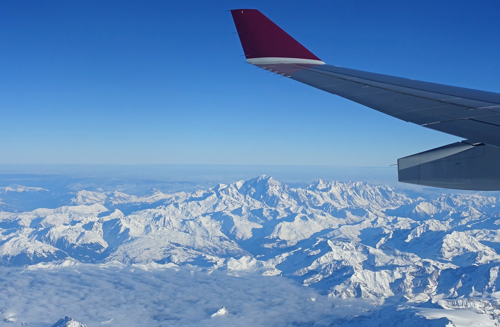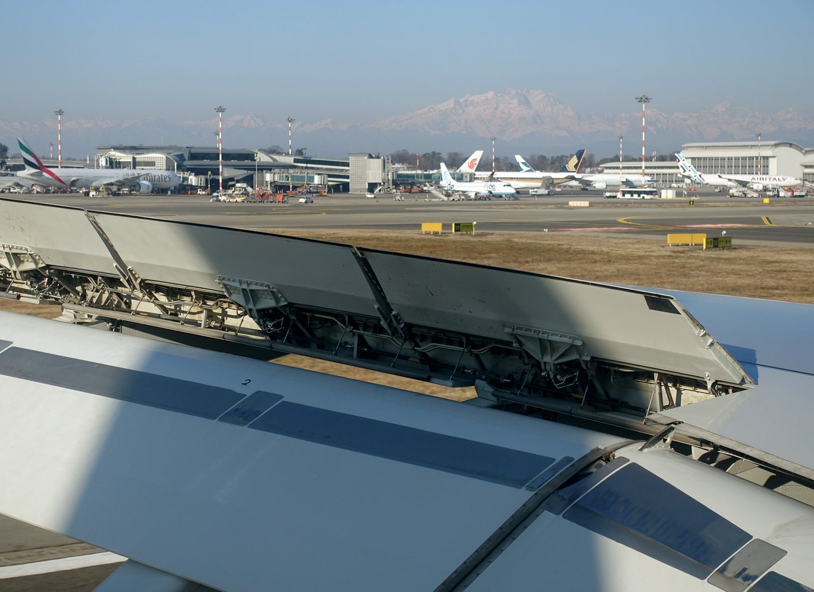 Cruising became smoother as we progressed, and at 8:45am Milan time, 2:45am in New York, the cabin lights came back on as we completed our oceanic crossing with an hour and a half to go. During the descent, the usual amazing views of the Alps appeared, with Mont Blanc dominating the scene — a major reason for getting a window seat into and out of MXP. We touched down very smoothly at 10:09am local, 41 minutes ahead of schedule and greeted by a rare commodity in Milan: the brightest of blue skies and Mount Rose towering over the horizon above the airport.