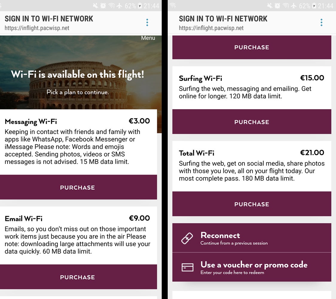 Just like with the food, there was sort-of-good news and bad news here. Wi-Fi was the good news, with a stable connection fast enough to stream video. The most expensive option was for 180 MB of traffic for 21 euros ($25), which is plenty enough to work with text but gets eaten up fast by video or heavy image files. I made it last for the duration of the flight, but make sure you have automatic updates turned off if you are using your phone, or that 180 MB will go quickly. There were three other options at the same connection speed but different prices, depending on the amount of data available.