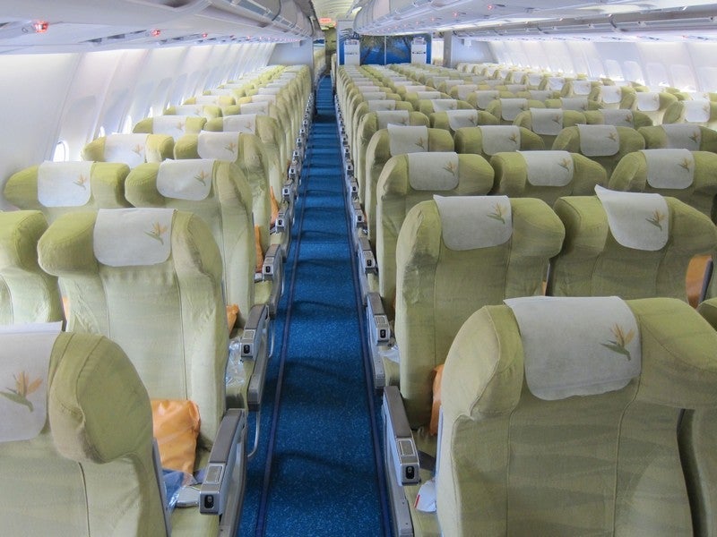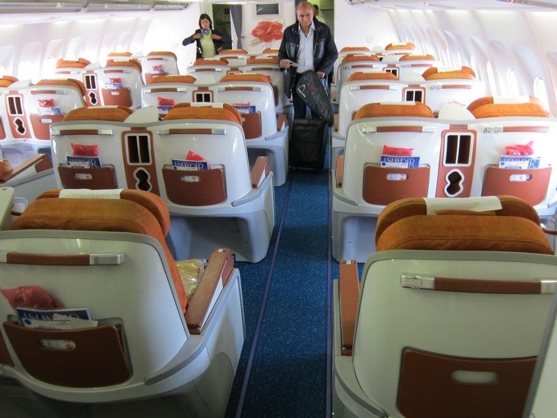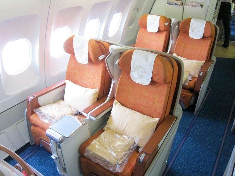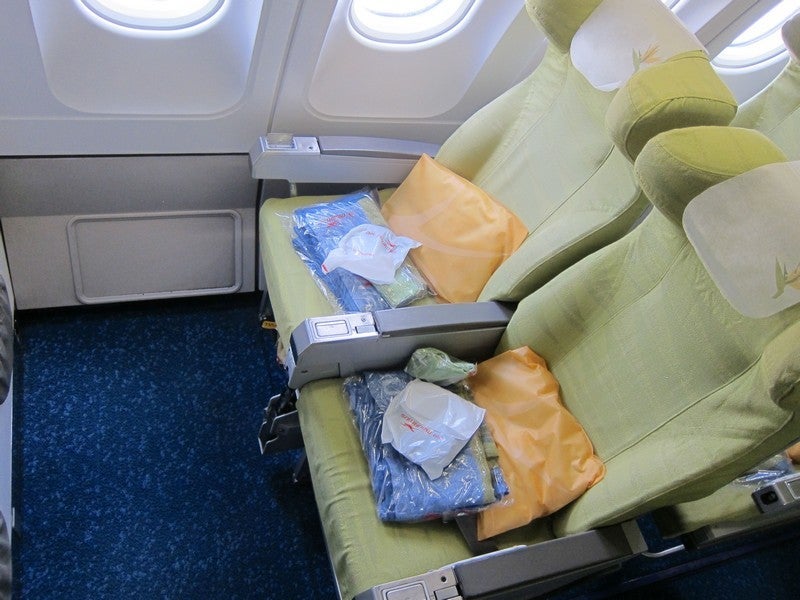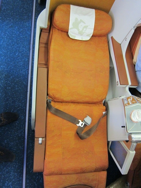 I snapped a couple pictures of the coach cabin before turning left to business class. The coach seats were a bright yellow and business class a deep orange. I loved how Air Mauritius was unapologetically tropical in the decor. The coach seats actually looked really comfortable and padded and the bulkhead seats had tons of legroom. While I still wouldn't want to ride in them for 11.5 hours, I was impressed.