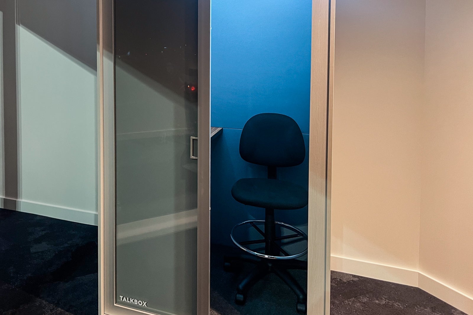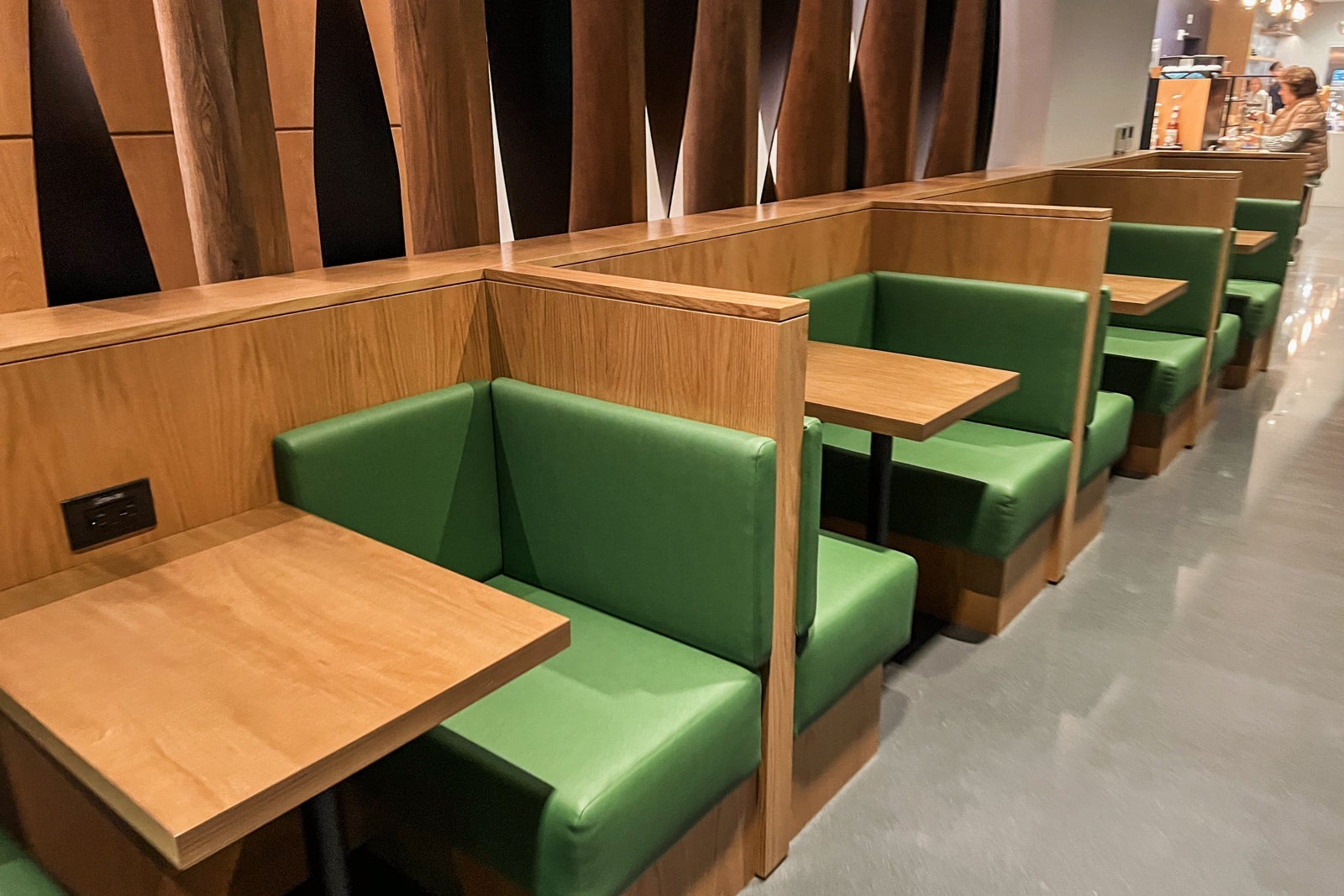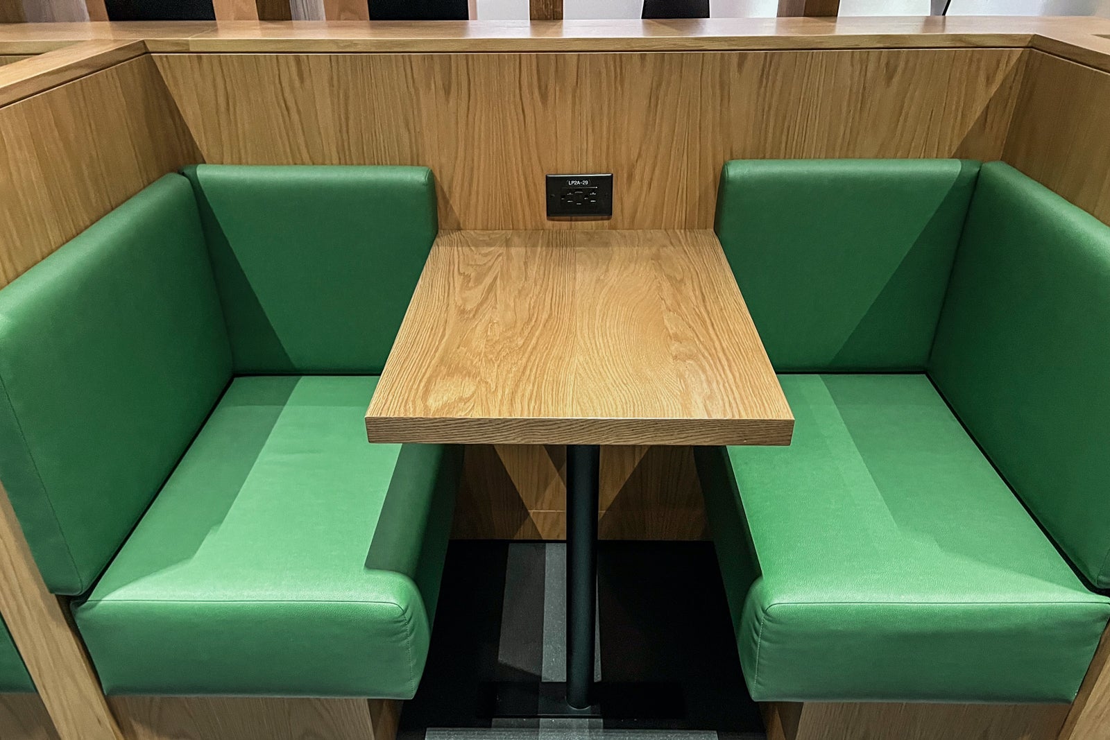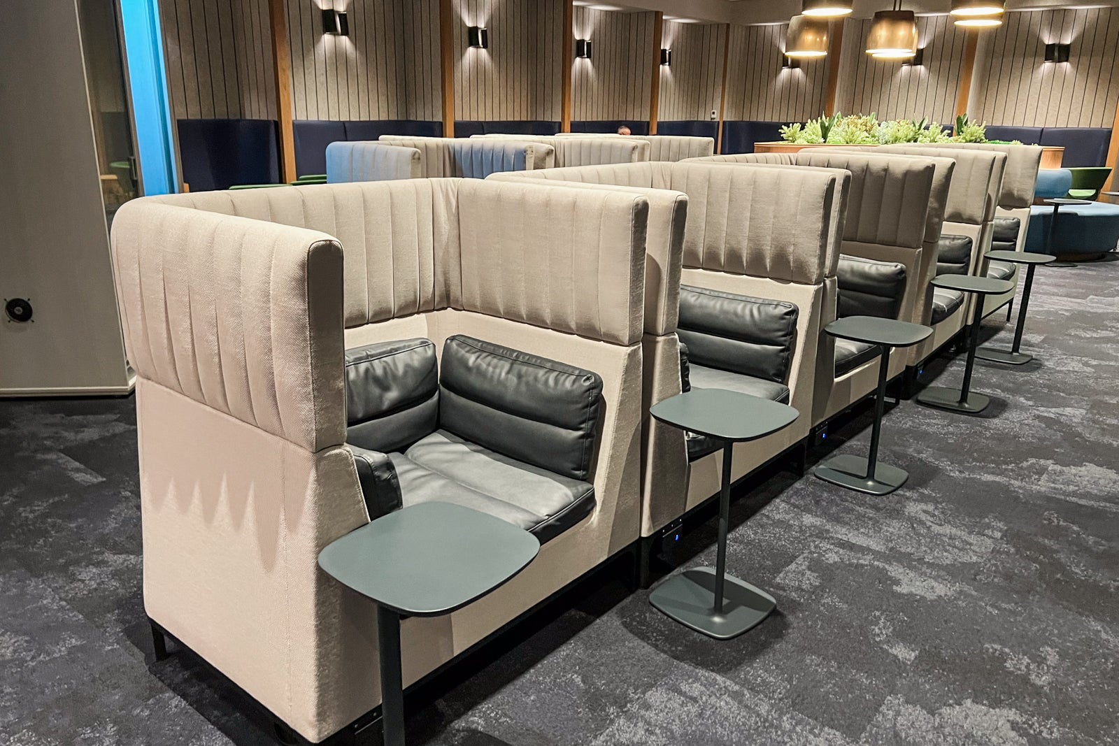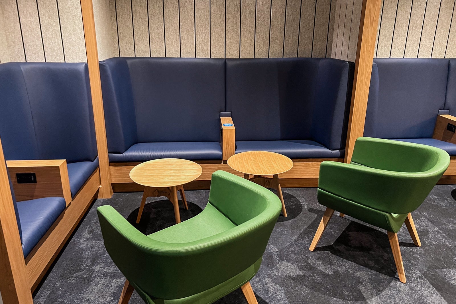 There are also high-back sofa chairs and some private booths for sound-resistant work areas.