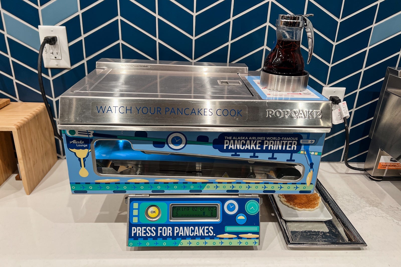 Of course, there's also the famous Alaska Lounge feature: a pancake machine by Popcake. It's a fully automatic pancake machine that has now become standard at Alaska Lounges. Yum.