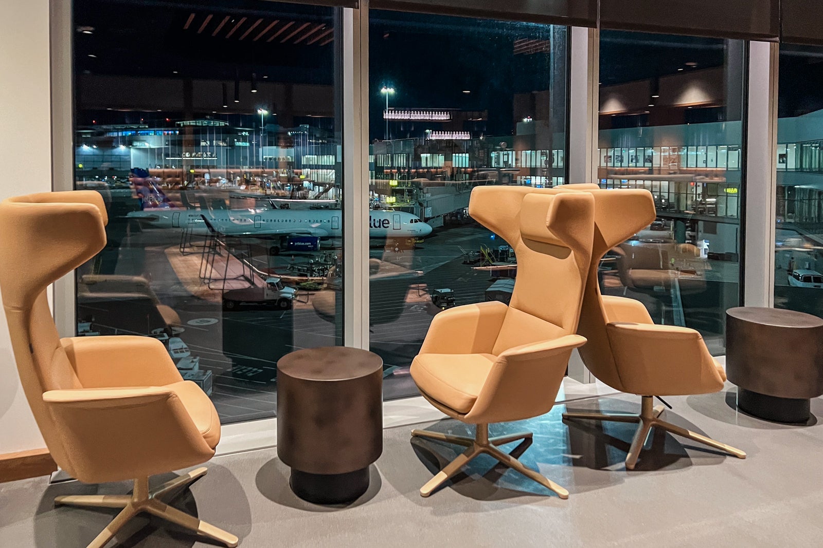 There are plenty of seating and lounging areas, including four-top tables, individual desklike setups and comfy high-back chairs with views of the tarmac.