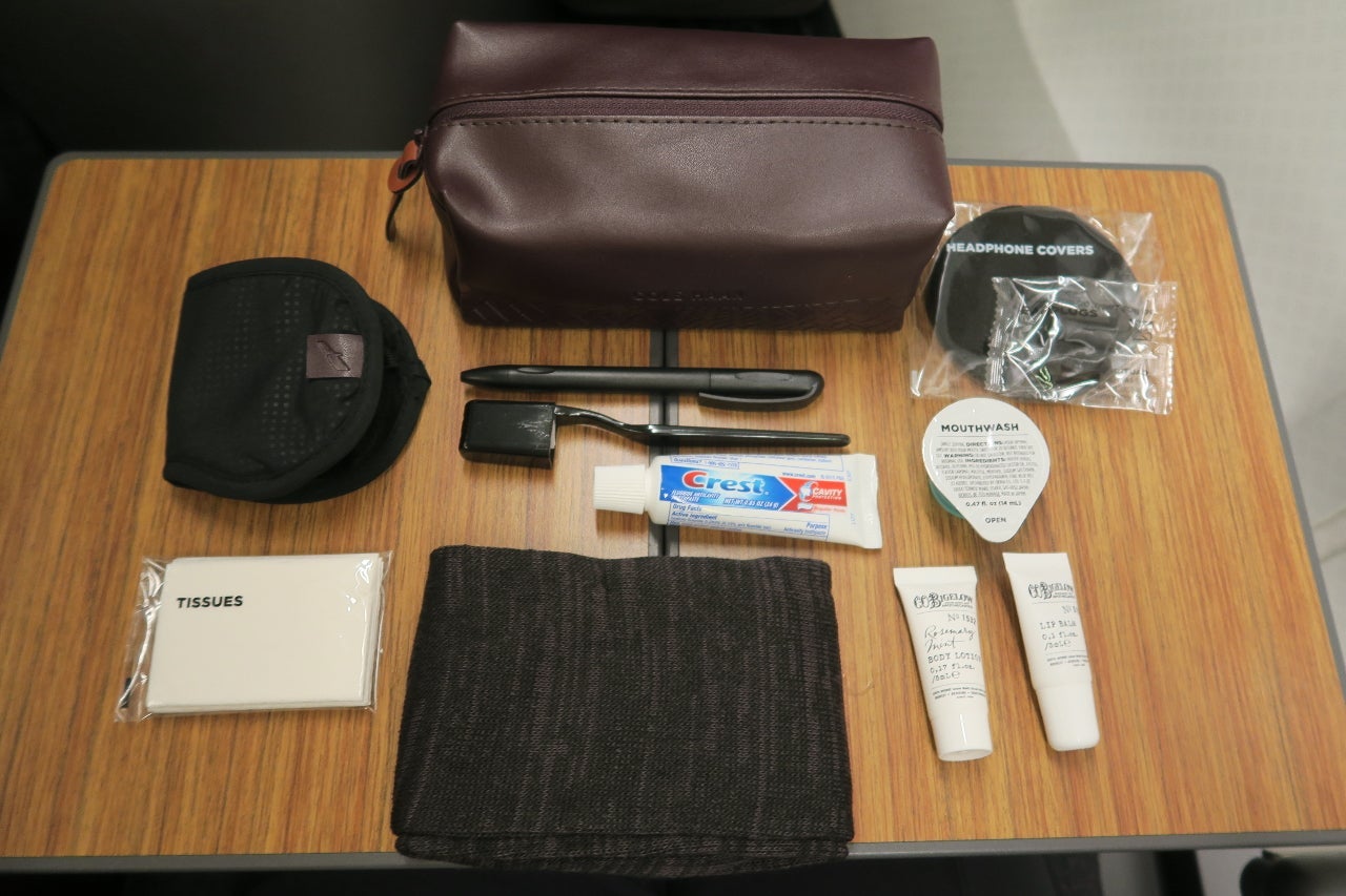 Amenity kits were waiting at each seat during boarding. These amenity kits contain socks, an eye mask, ear plugs, tissues, a pen, a toothbrush and toothpaste, mouthwash, headphone covers, lotion and lip balm.