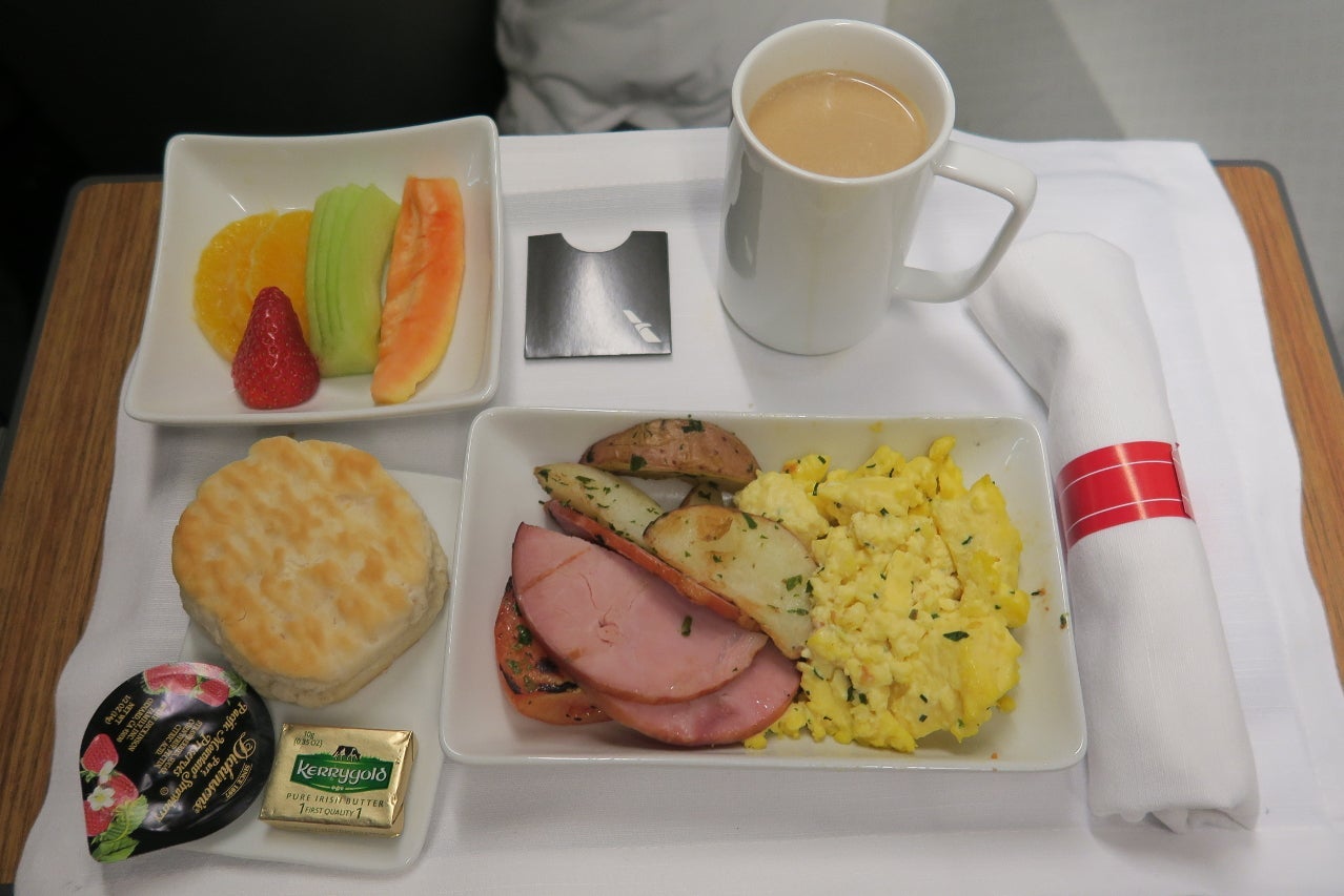 The breakfast service began five hours and 40 minutes after take-off, which was about an hour before landing. Breakfast options were: