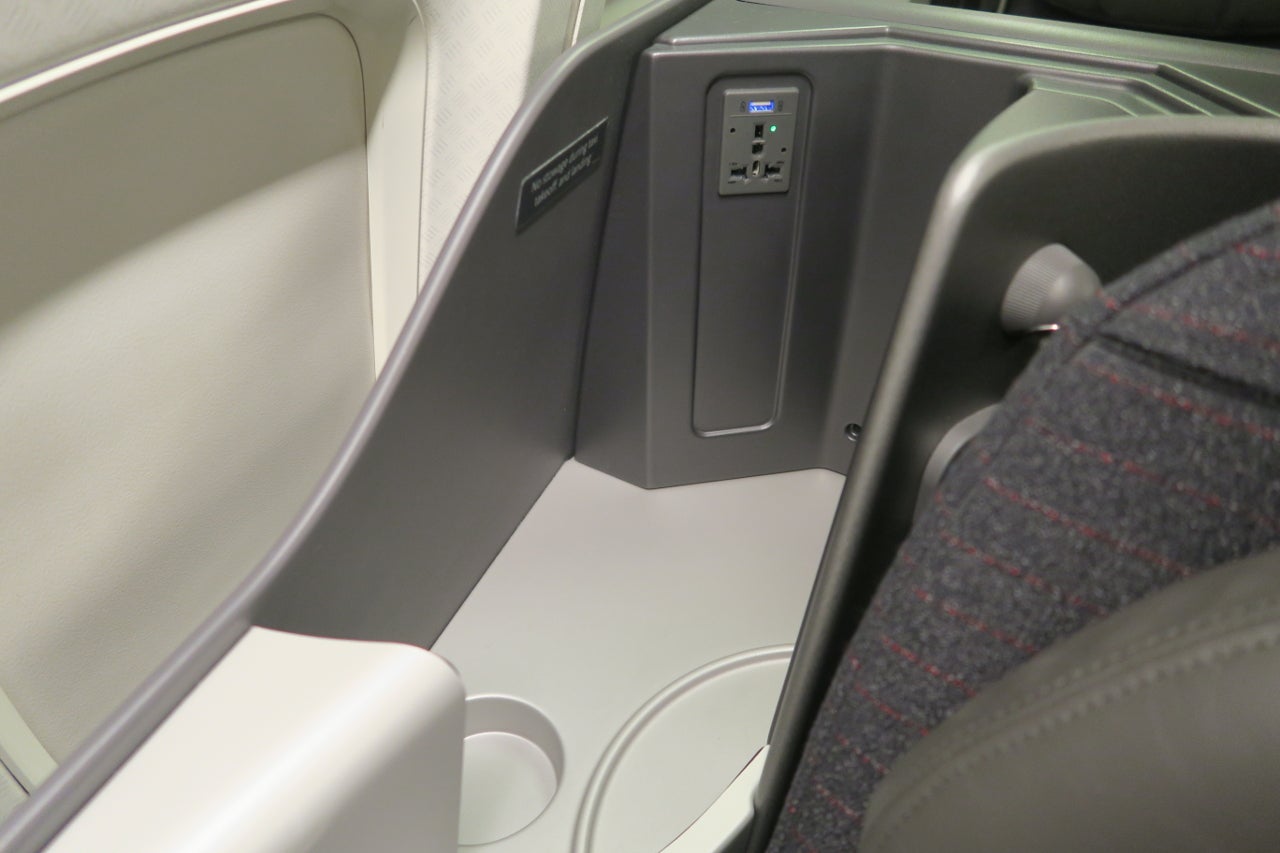 Although less than what I've experienced on other AA intercontinental business class seats, the storage at these seats isn't terrible. There's a nook by the window that easily fit my phone, amenity kit, water bottle and headphones. There's a universal power outlet and a USB outlet in this nook.