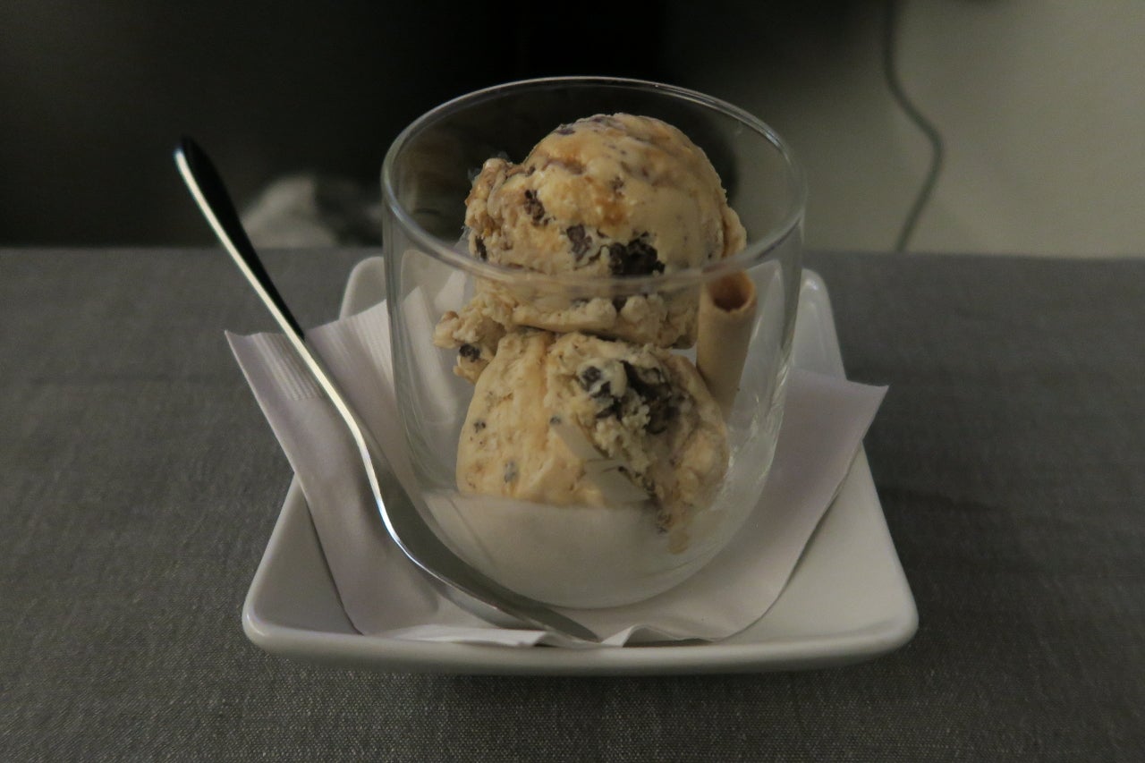 My tray was taken away five minutes after I finished. The flight attendant took my dessert and post-meal drink order while removing the tray. The dessert options were caramel cone ice cream, a gourmet cheese plate or a raspberry tart. I ordered ice cream and coffee, which arrived two minutes later.