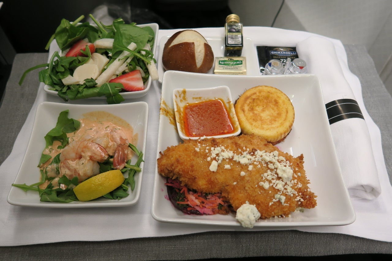 The buffalo skillet chicken was one of the best business class main courses I've eaten on American. The chicken was moist, the breading on the chicken was tasty and crispy and the corn cakes were well seasoned. In addition to the main course, each tray contained a poached shrimp rémoulade small plate and baby spinach and arugula salad. There were four types of bread to choose from, including pretzel bread.