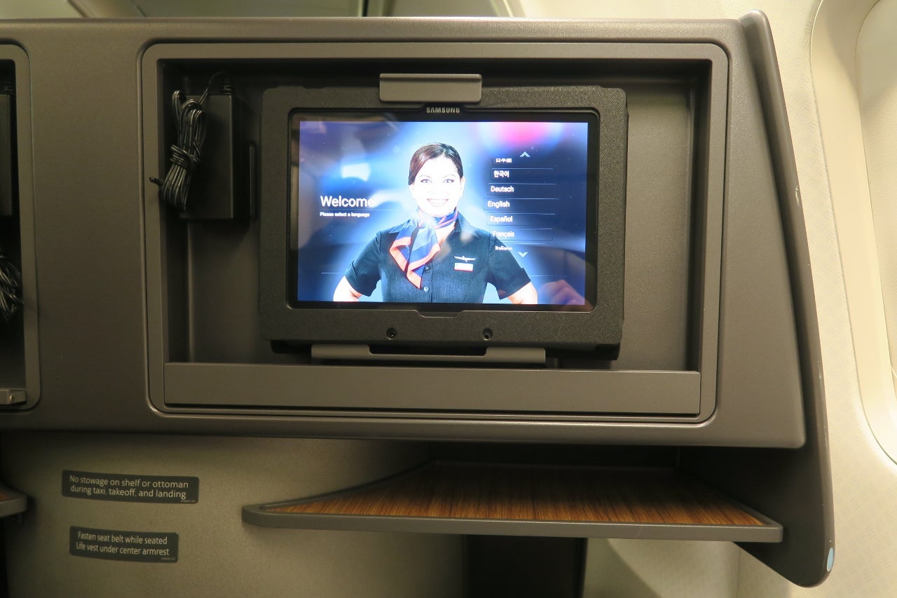 A packaged full-size Casper pillow and comforter were waiting at each seat. The comforter was soft and warm and I appreciated having a full-size pillow when trying to sleep. Samsung Galaxy Tab 4 IFE tablets were mounted at each business class seat during boarding — they really look awkward in their allotted space, which is normally meant for a much bigger built-in entertainment screen. Strangely, they weren't plugged in, which meant their batteries were draining until you realized to plug them in. However, there was a friendly reminder to plug the device in after choosing a language on the device. Still, I can imagine many passengers quickly skip past this warning or assume the device is already plugged in. Once plugged in, my tablet reached and then stayed at 100% charge.