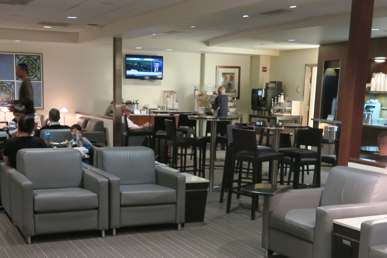 After connecting to PHL, I visited the Admiral's Club between gates A4 and A6A. I had access the lounge two ways: As an Executive Platinum elite or as a business-class passenger on this flight. This Admiral's Club lounge is really small, as we found out when we reviewed it, which meant there weren't many places to sit. Normal Admiral's Club snacks were on offer: two type of soups, hummus, carrots, olives, tomatoes, cookies and brownies.