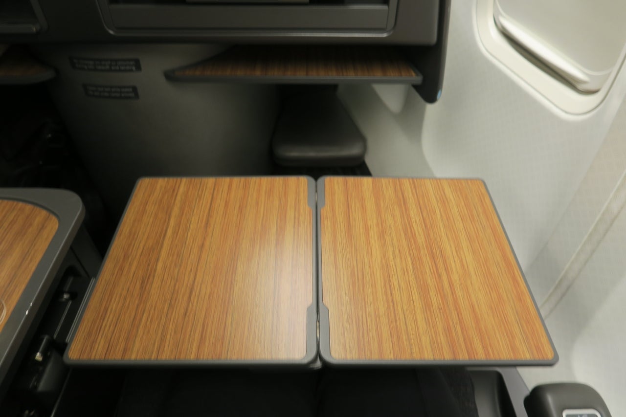 A large tray table can easily be extended from a compartment on the side of the seat.