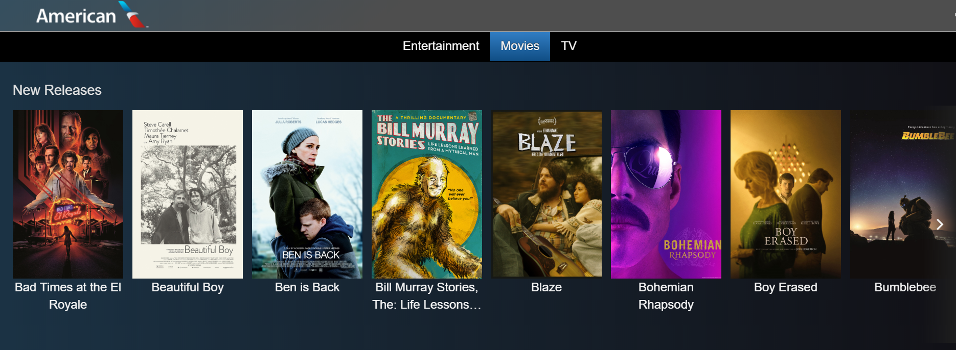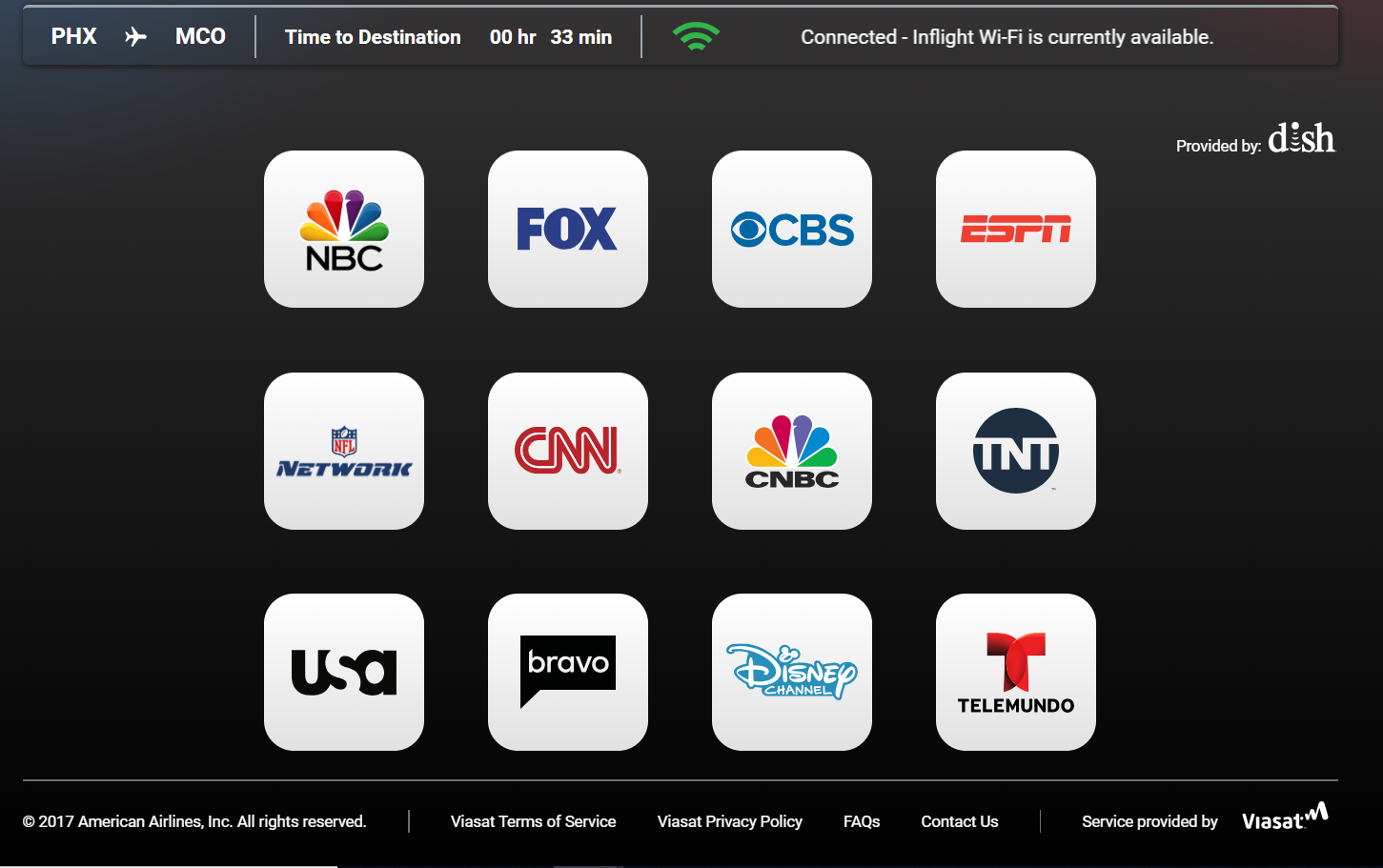 In April 2019, American Airlines is streaming 162 movies, 239 TV episodes and 12 channels of live TV for free through the ViaSat Wi-Fi system.