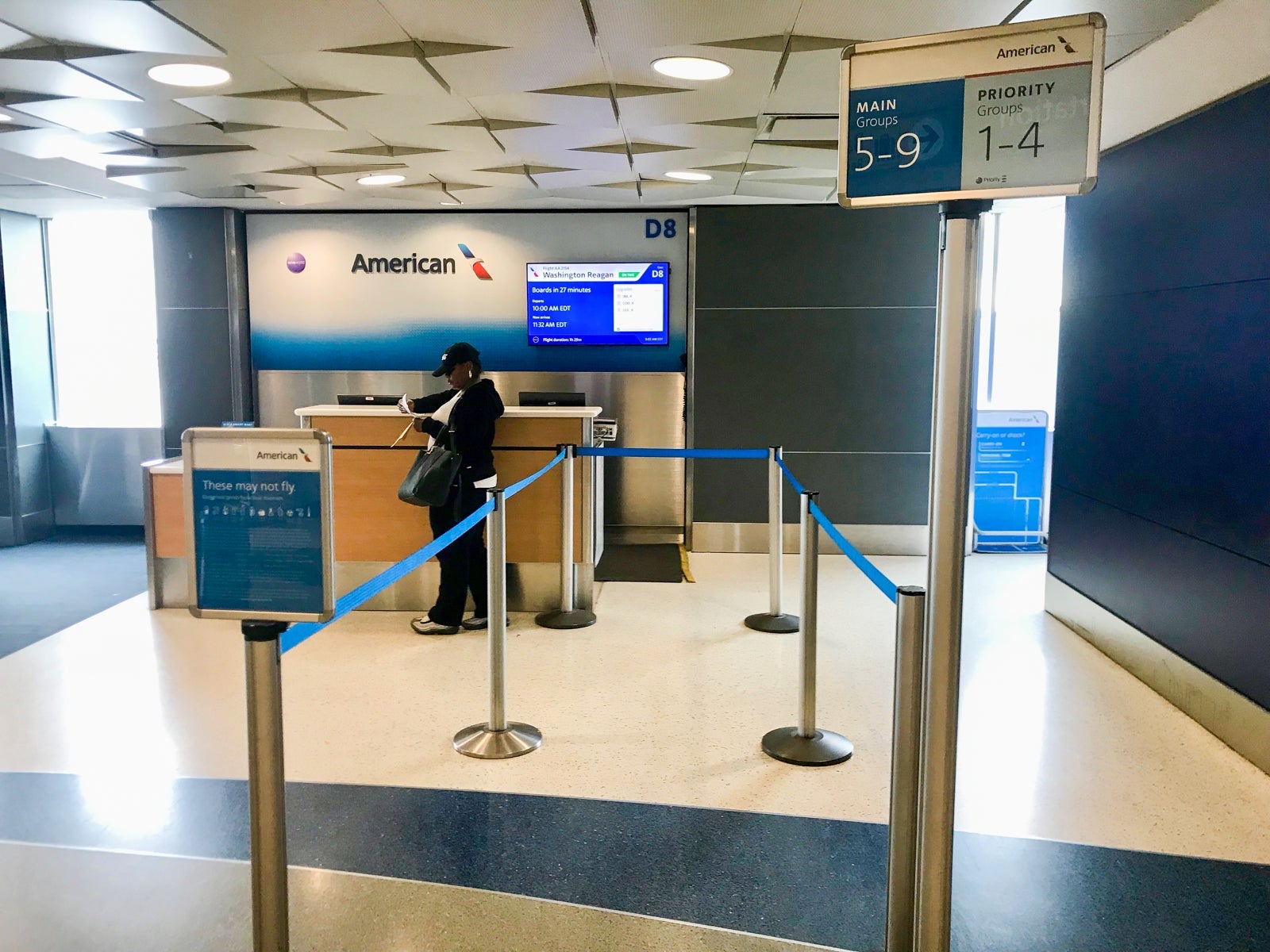 The flight was only about 60% full, so the gate area remained fairly empty. American observes a tight 20-minute check-in cutoff for its shuttle flights, so it's probably a safe bet a notable portion of the passengers were not present at the gate yet at the time of boarding. After a few welcome announcements, the gate agent commenced the boarding process exactly on time, at 9:30am.