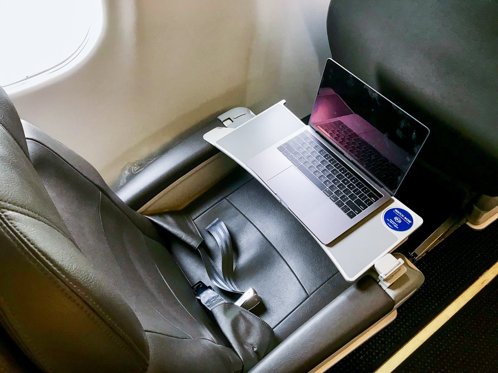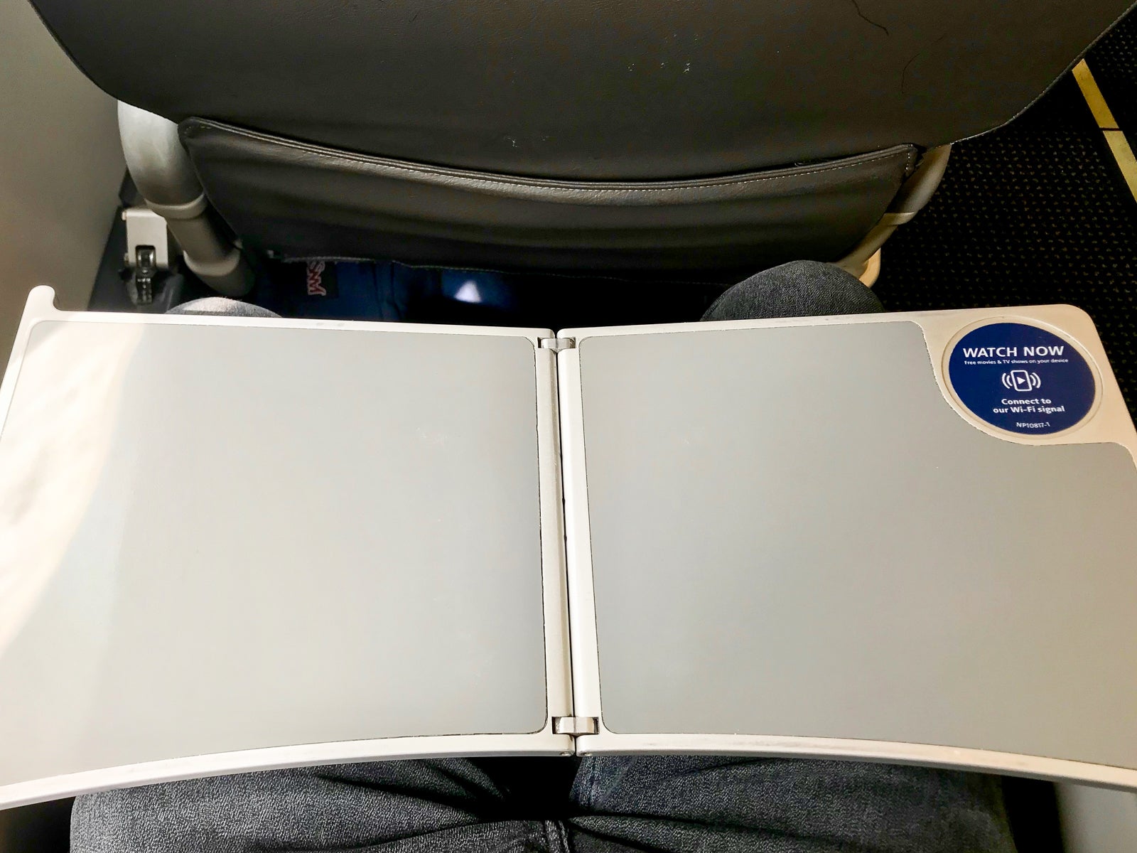 The tray table was in the armrest and folded out in two parts. It was sufficiently large for me to comfortably work on a laptop while still having room to spare for a drink or snack.