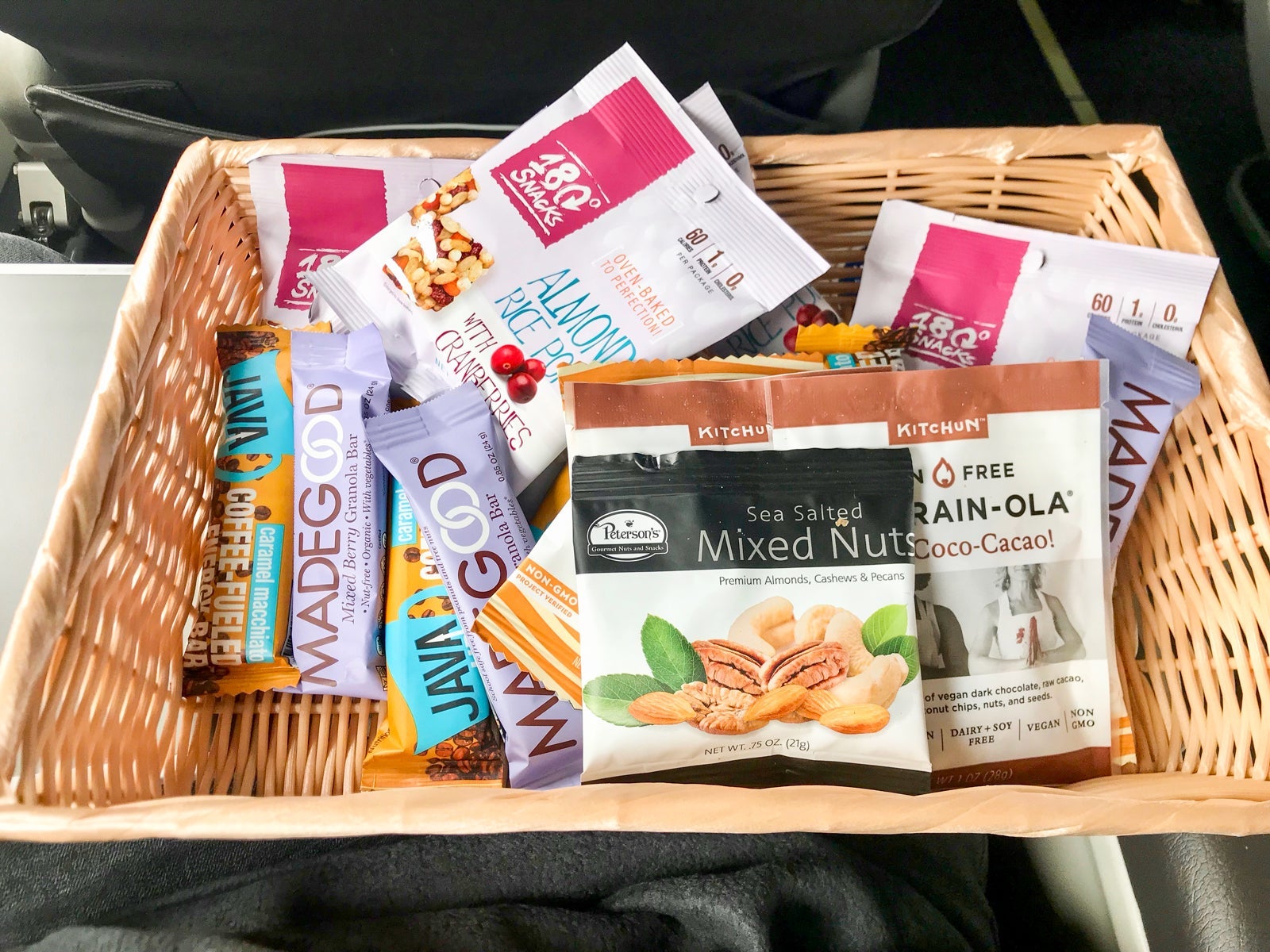 Shortly after takeoff, the flight attendant came through the cabin with a basket of a variety of salty and sweet snacks. After one pass, she made another round insisting we take seconds and thirds, and I happily obliged her.