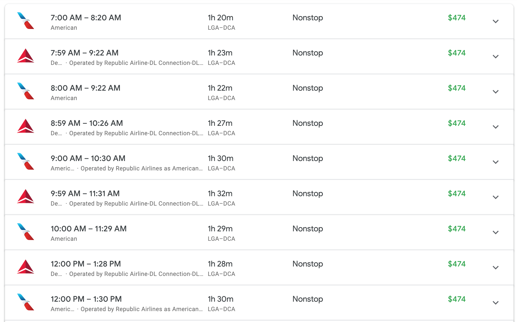 Given the volume of high-yield business travelers who frequent this shuttle route, cheap weekday flights between New York City and Washington, DC, are hard to come by unless you book at least a month in advance. Delta and American -- the route's two largest players -- often charge identical fares across their combined 25 daily flights. For the day I was looking to fly, coach fares were $474 across the board, while first class started at $533 and peaked at $566.
