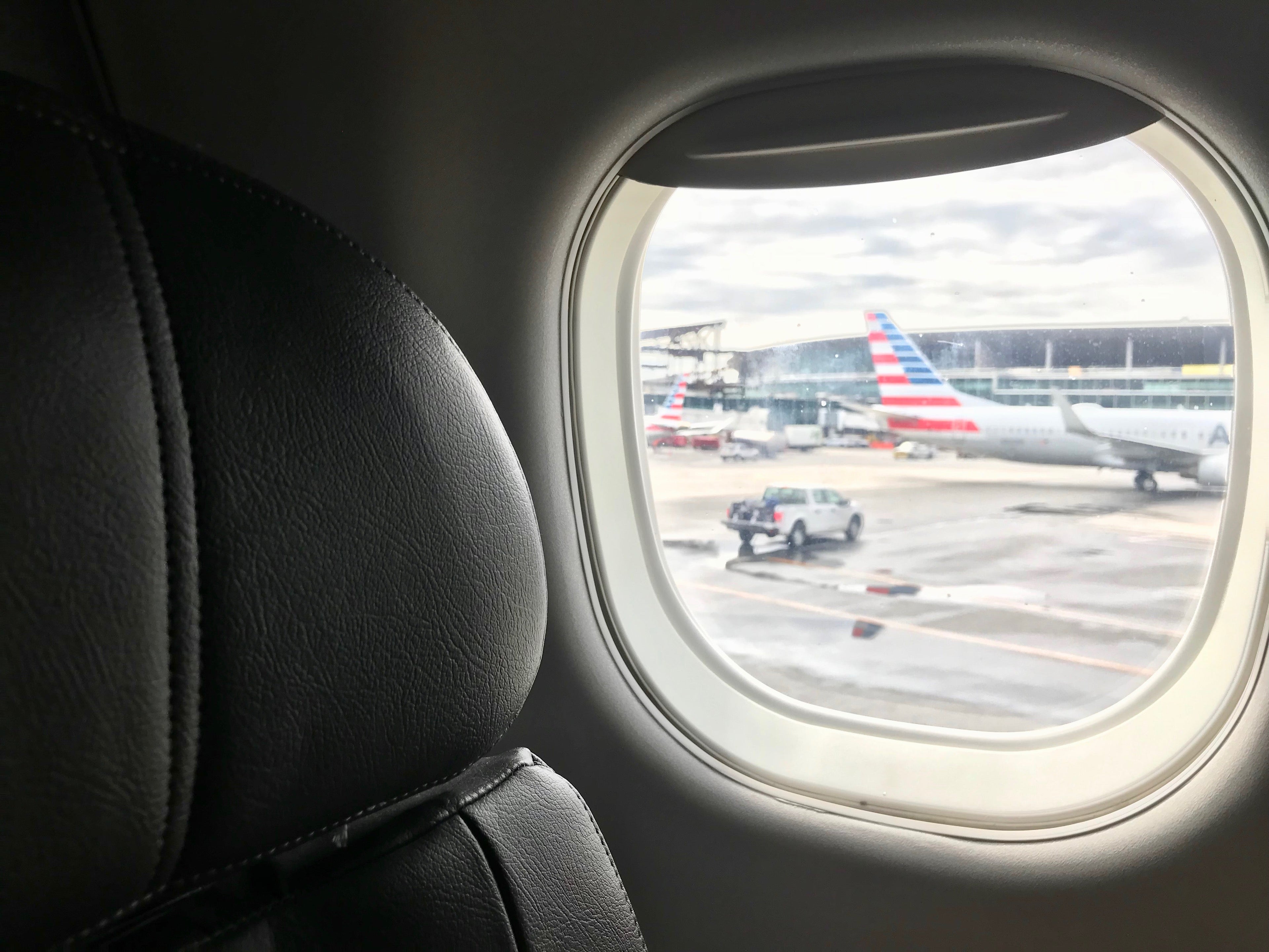 Our 99-seat Embraer E190 had just pulled in from DCA and was quickly cleaned and catered in advance of our 9:30am boarding time. The 11-year old aircraft, originally delivered to US Airways, was acquired by American Airlines in the subsequent 2015 merger. Despite classifying as a regional jet, these planes operate under mainline American Airlines rather than American Eagle, as the slightly smaller Embraer E175s do.