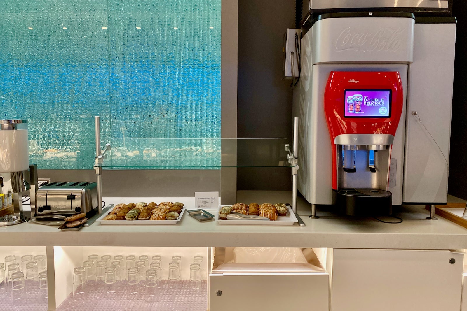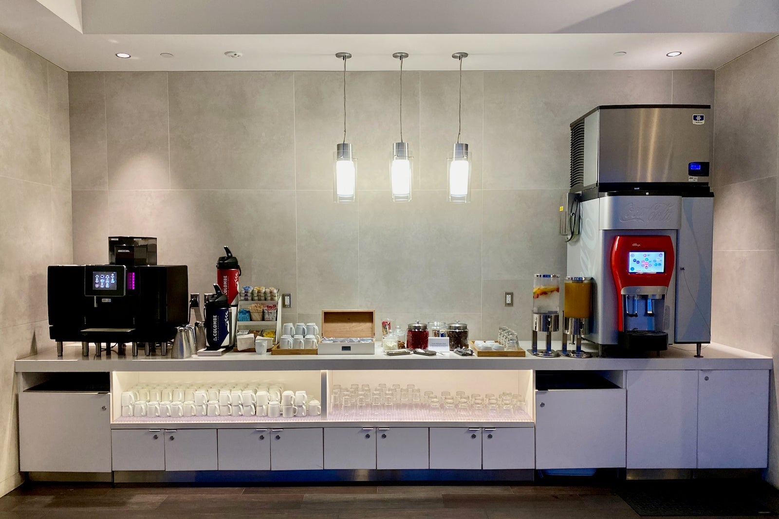 The refreshment station had a Franke coffee machine, Coke Freestyle machine and La Colombe drip coffee.