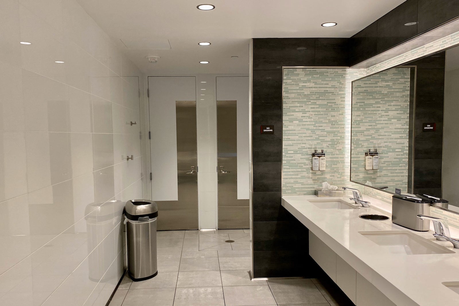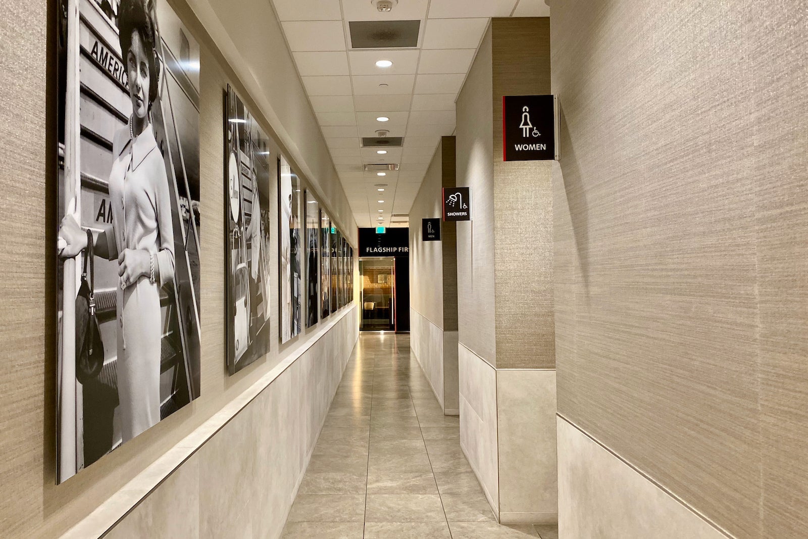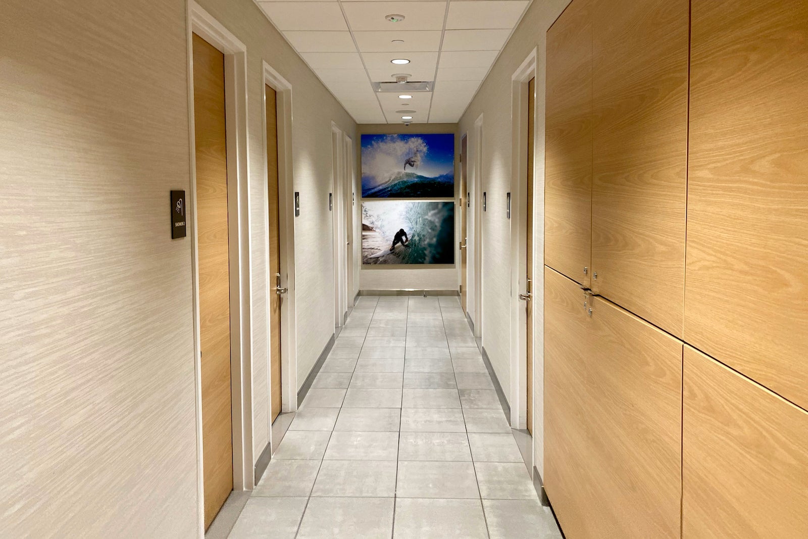 The restrooms and eight shower rooms are located along a narrow corridor just to the right of the lounge's entrance.