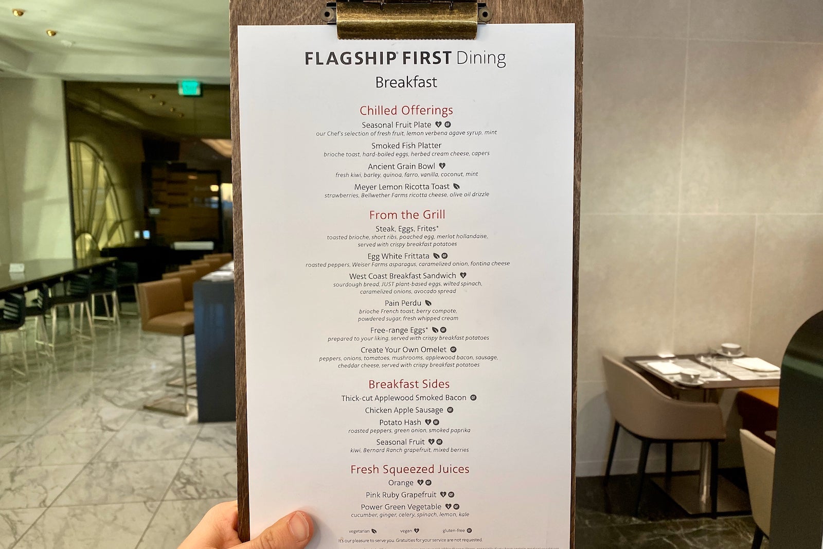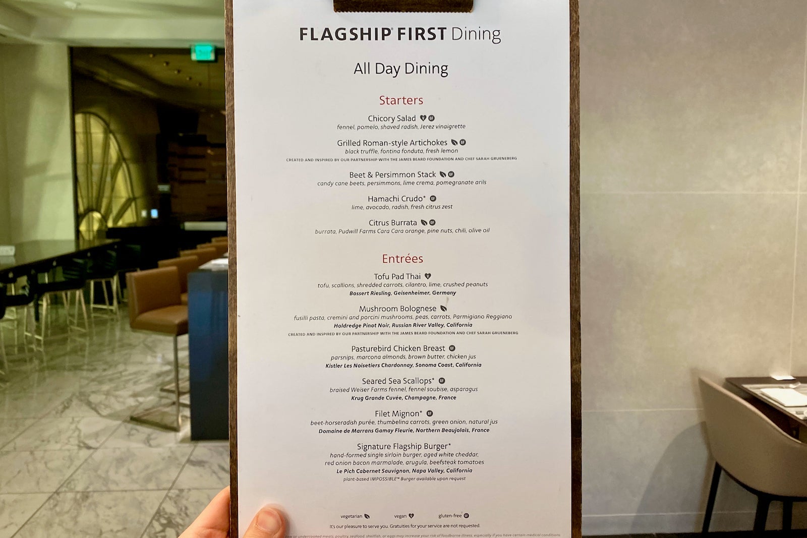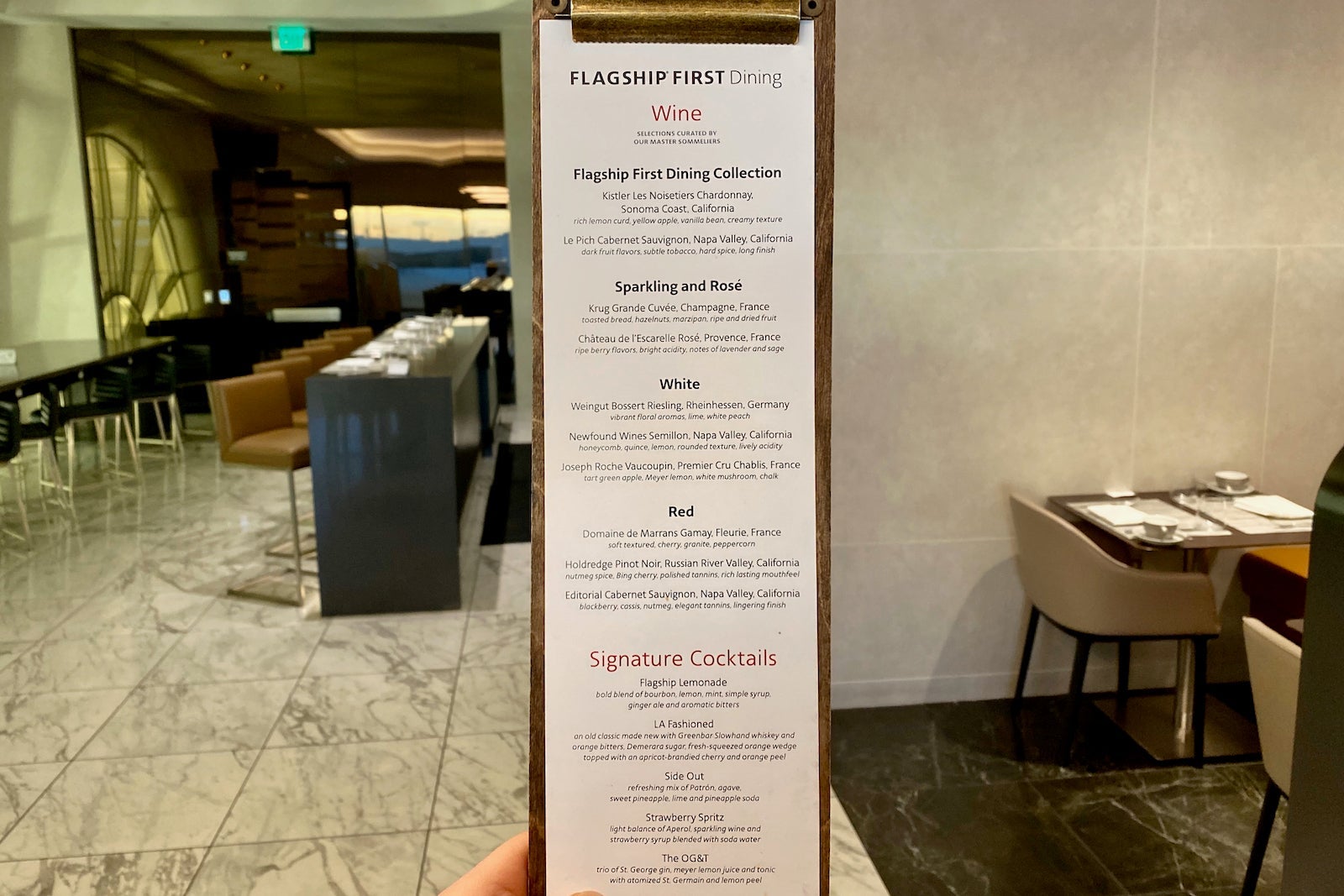 Flagship First Dining is AA's lounge-within-a-lounge concept. It offers sit-down dining with chef-inspired food and top-shelf liquor and wine.