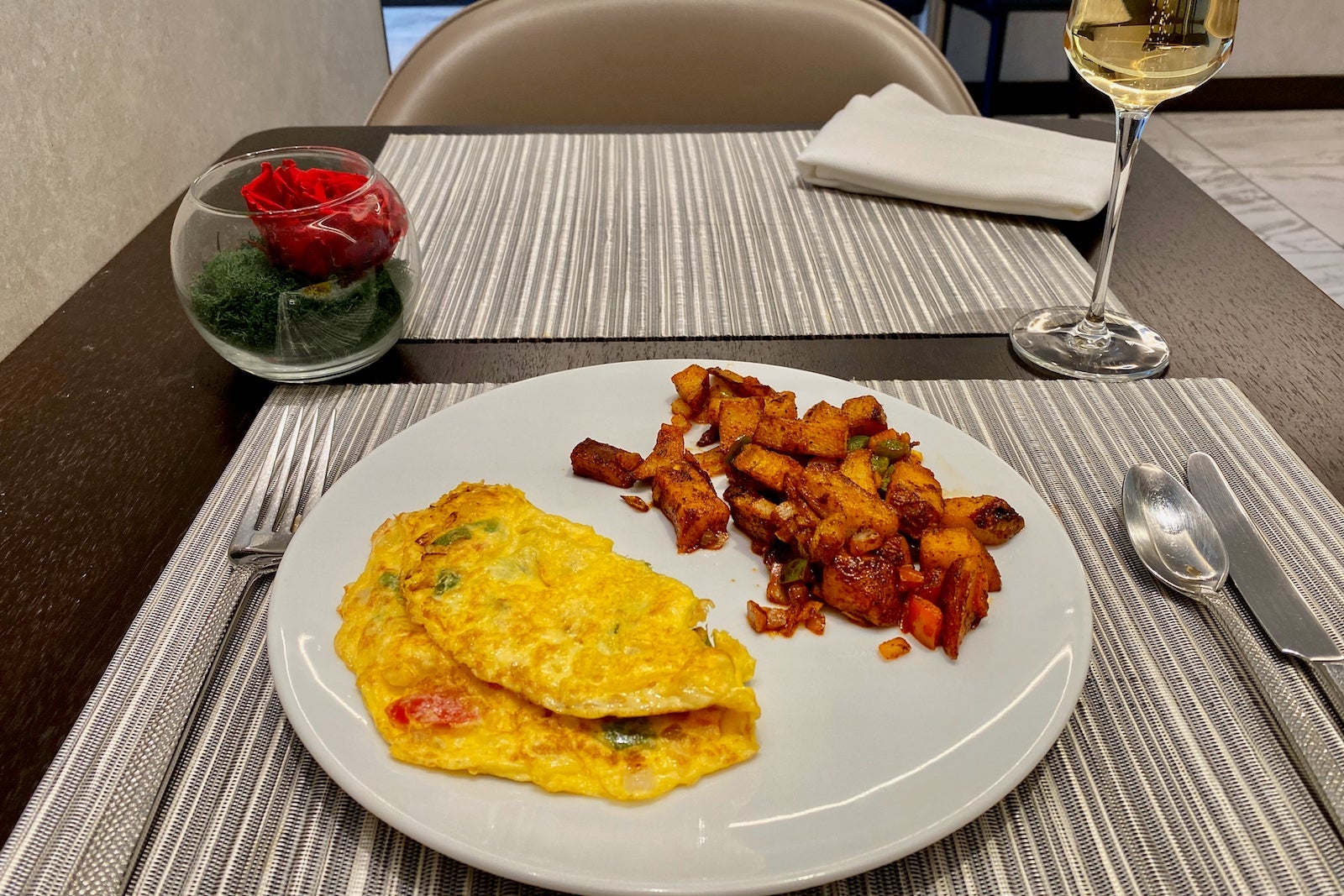 There were two very minor missteps: No one asked to hang my jacket when I boarded and I had to ask for a missing fork during my meal.
