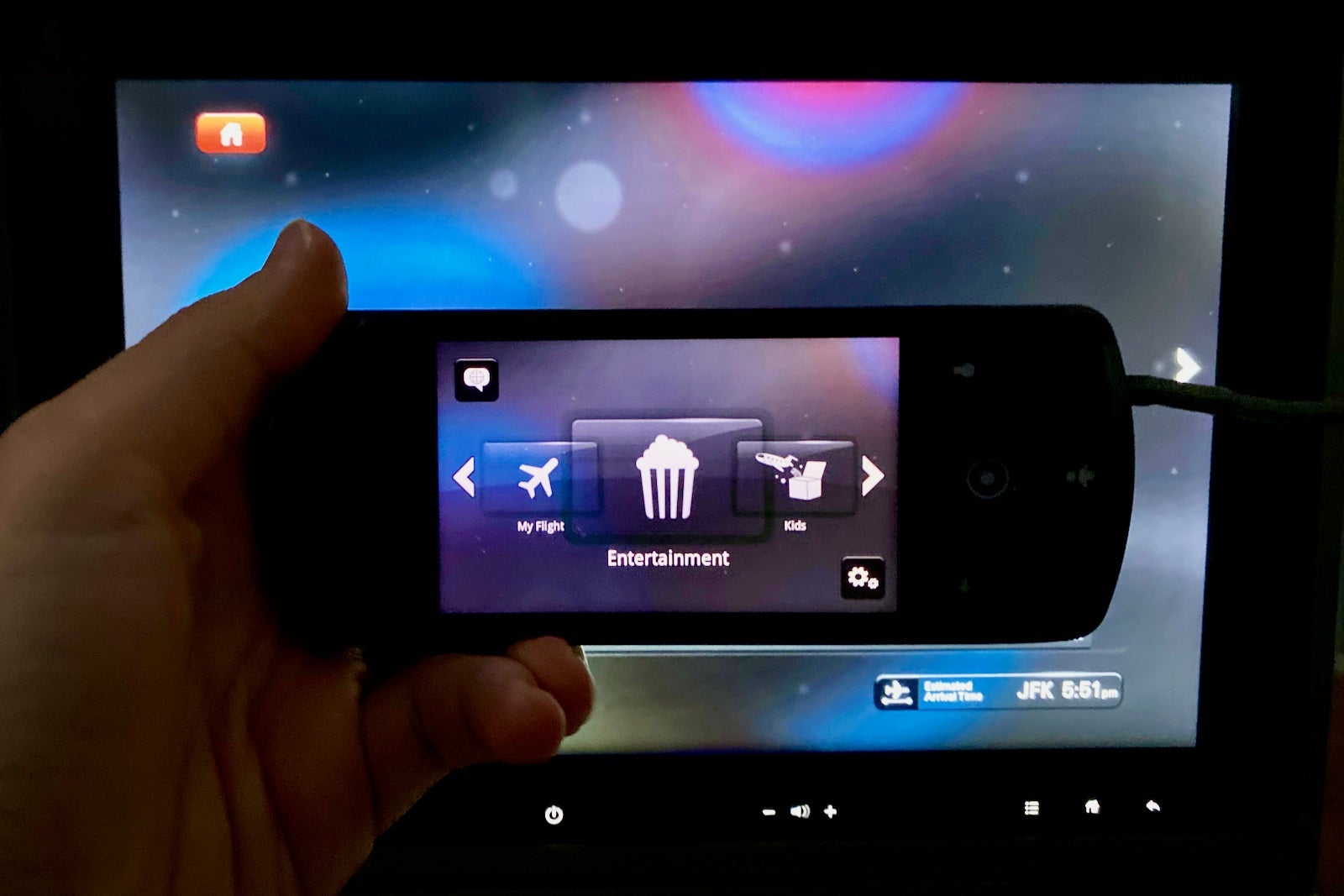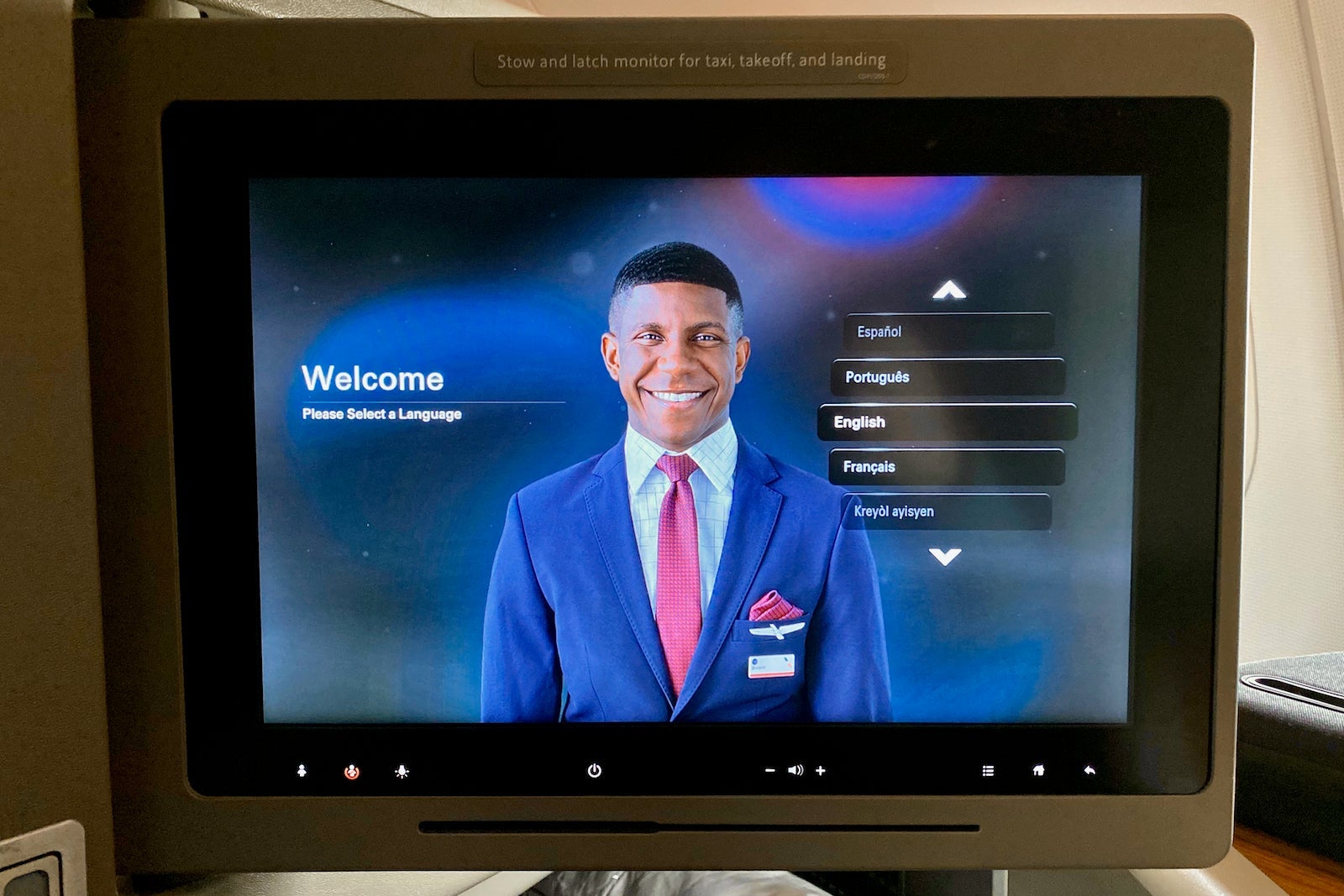 The 15.4-inch touchscreen TV swivels out from the seat in front. It doesn't tilt up or down, making it hard to watch a show while in bed mode.