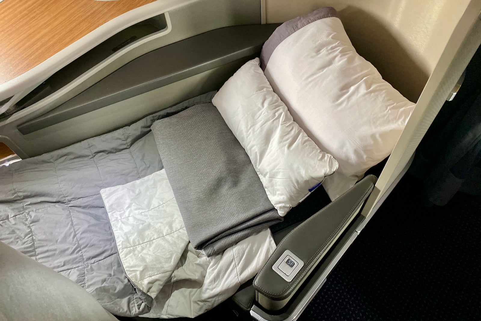 The seat converts to a 78-inch-long, lie-flat bed. Plus, the aisle armrest lowers to add about six more inches of seat width to the center portion of the seat. Combined with the oversize footwell, I had no trouble napping on this flight.